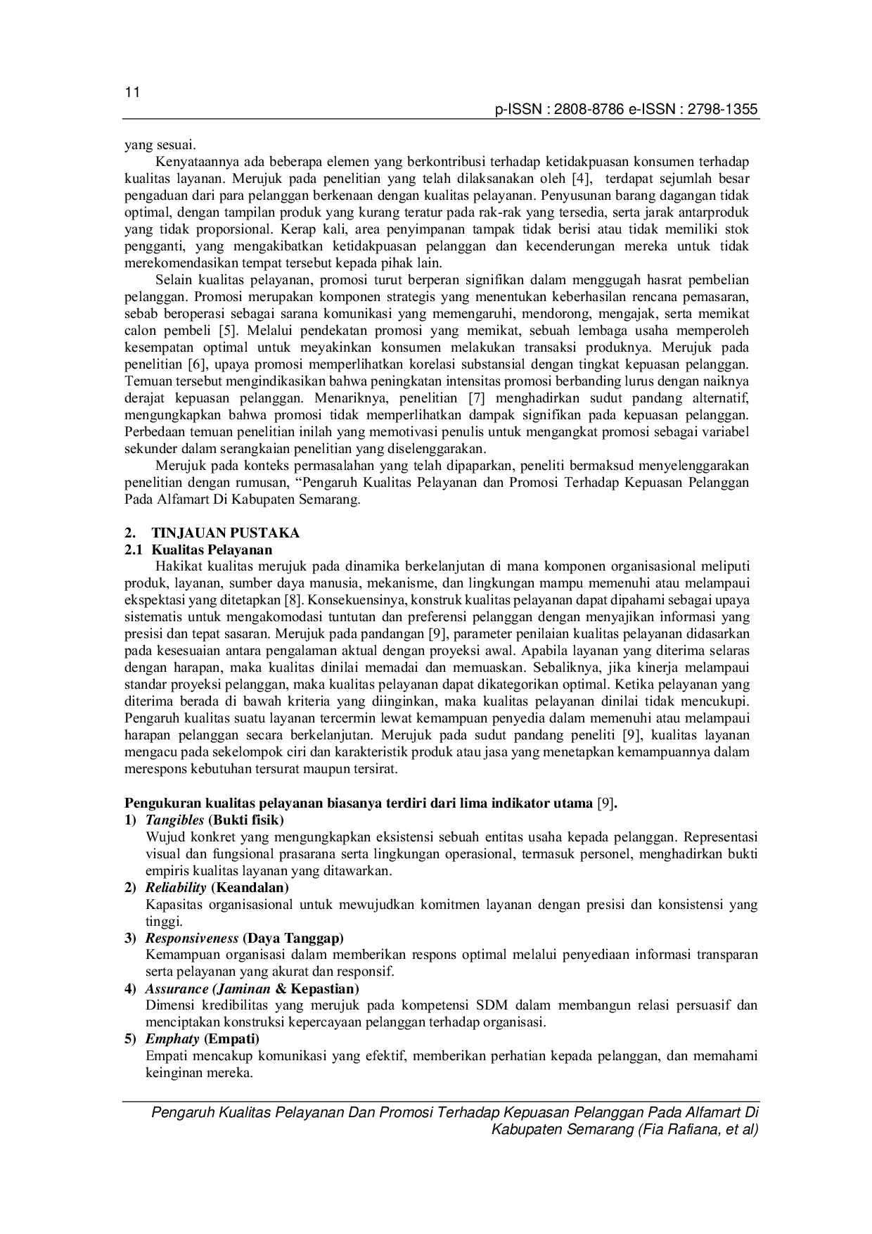 Dinamika: Jurnal Manajemen Sosial EkonomiDinamika: Jurnal Manajemen Sosial EkonomiPenelitian ini bertujuan untuk mengidentifikasi dampak kualitas pelayanan dan promosi terhadap kepuasan pelanggan pada Alfamart di Kabupaten Semarang. Kelompok subjek penelitian meliputi penduduk di kawasan Ungaran Barat Kabupaten Semarang. Metode pemilihan responden menggunakan pendekatan non-probabilitas, khususnya metode selektif terarah. Responden mencakup warga Ungaran Barat yang telah melewati ambang usia 17 tahun dan pernah melakukan transaksi di Alfamart Kabupaten Semarang. Mekanisme pengumpulan informasi dilaksanakan melalui penyebaran instrumen survei dengan menerapkan skala penilaian bertingkat. Data diproses melalui uji regresi multipel. Penemuan penelitian mengungkapkan bahwa kualitas pelayanan berpengaruh signifikan terhadap kepuasan pelanggan, berdasarkan hasil uji statistik yang menampilkan angka signifikansi pengaruh kualitas pelayanan sebesar 0,000 yang berada di bawah 0,05 (0,000 < 0,05), dengan statistik pengujian 5,727 melampaui ambang kritis 1.986 (5.727 > 1.986). Promosi turut memberikan sumbangan bermakna pada kepuasan pelanggan, tercermin lewat pengujian yang menghasilkan angka signifikansi 0,002 di bawah batas 0,05 (0,002 < 0,05) serta statistik pengujian 3,211 yang melampaui ambang kritis 1,986 (3,211 > 1,986). Lebih lanjut, kepuasan pelanggan dipengaruhi secara serentak oleh kualitas pelayanan dan promosi, yang terlihat dari analisis dengan angka signifikansi 0,000 < 0,05 pada uji simultan dan statistik 153,608 yang melampaui nilai kritis 3,09 di Kabupaten Semarang pada Alfamart.