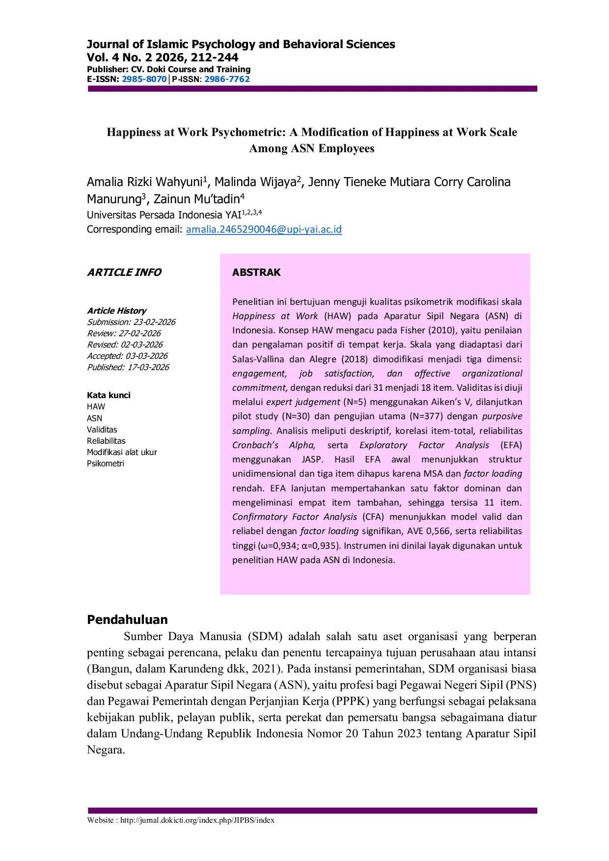 Journal of Islamic Psychology and Behavioral SciencesJournal of Islamic Psychology and Behavioral SciencesPenelitian ini bertujuan menguji kualitas psikometrik modifikasi skala Happiness at Work (HAW) pada Aparatur Sipil Negara (ASN) di Indonesia. Konsep HAW mengacu pada Fisher (2010), yaitu penilaian dan pengalaman positif di tempat kerja. Skala yang diadaptasi dari Salas-Vallina dan Alegre (2018) dimodifikasi menjadi tiga dimensi: engagement, satisfaction, dan affective organizational commitment, dengan reduksi dari 31 menjadi 18 item. Validitas isi diuji melalui expert judgement (N=5) menggunakan Aikens V, dilanjutkan pilot study (N=30) dan pengujian utama (N=377) dengan purposive sampling. Analisis meliputi deskriptif, korelasi item-total, reliabilitas (EFA) Cronbachs Alpha, menggunakan struktur unidimensional dan tiga item dihapus karena MSA dan factor loading rendah. EFA lanjutan mempertahankan satu faktor dominan dan mengeliminasi empat item tambahan, sehingga tersisa 11 item. Confirmatory Factor Analysis (CFA) menunjukkan model valid dan reliabel dengan factor loading signifikan, AVE 0,566, serta reliabilitas tinggi (ω=0,934; α=0,935). Instrumen ini dinilai layak digunakan untuk penelitian HAW pada ASN di Indonesia.