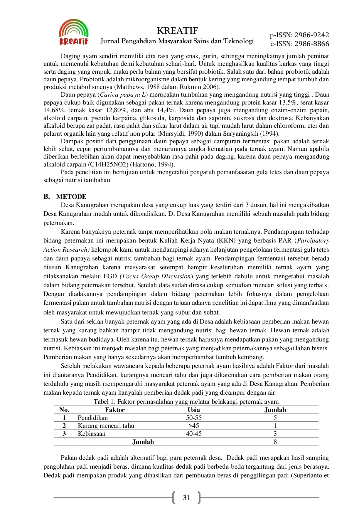 KREATIF: Jurnal Pengabdian Masyarakat Sains dan TeknologiKREATIF: Jurnal Pengabdian Masyarakat Sains dan TeknologiPakan merupakan salah satu hal yang sangat menentukan dalam keberhasilan usaha peternakan. Pada musim kemarau pakan yang berkualitas sulit didapatkan hal ini mengakibatkan peternak terpaksa memanfaatkan tetes tebu dan daun pepaya. Pakan fermentasi merupakan pakan ternak yang telah melalui proses perubahan struktur kimia yang dibantu oleh bakteri yang terkandung dalam gula tetes dan Em4. Tujuan yang ingin dicapai dari pembuatan pakan fermentasi berbahan daun pepaya yaitu untuk membantu peternak dalam penyediaan pakan ternak yang berkualitas dimusim kemarau serta membantu dalam pemanfatan bahan yang ada disekitar.
