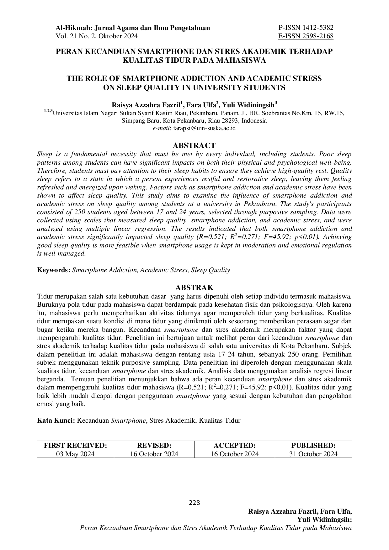 Al-Hikmah: Jurnal Agama dan Ilmu PengetahuanAl-Hikmah: Jurnal Agama dan Ilmu PengetahuanTidur merupakan salah satu kebutuhan dasar yang harus dipenuhi oleh setiap individu termasuk mahasiswa. Buruknya pola tidur pada mahasiswa dapat berdampak pada kesehatan fisik dan psikologisnya. Oleh karena itu, mahasiswa perlu memperhatikan aktivitas tidurnya agar memperoleh tidur yang berkualitas. Kualitas tidur merupakan suatu kondisi di mana tidur yang dinikmati oleh seseorang memberikan perasaan segar dan bugar ketika mereka bangun. Kecanduan smartphone dan stres akademik merupakan faktor yang dapat mempengaruhi kualitas tidur. Penelitian ini bertujuan untuk melihat peran dari kecanduan smartphone dan stres akademik terhadap kualitas tidur pada mahasiswa di salah satu universitas di Kota Pekanbaru. Subjek dalam penelitian ini adalah mahasiswa dengan rentang usia 17-24 tahun, sebanyak 250 orang. Pemilihan subjek menggunakan teknik purposive sampling. Data penelitian ini diperoleh dengan menggunakan skala kualitas tidur, kecanduan smartphone dan stres akademik. Analisis data menggunakan analisis regresi linear berganda. Temuan penelitian menunjukkan bahwa ada peran kecanduan smartphone dan stres akademik dalam mempengaruhi kualitas tidur mahasiswa (R=0,521; R2=0,271; F=45,92; p<0,01). Kualitas tidur yang baik lebih mudah dicapai dengan penggunaan smartphone yang sesuai dengan kebutuhan dan pengolahan emosi yang baik.