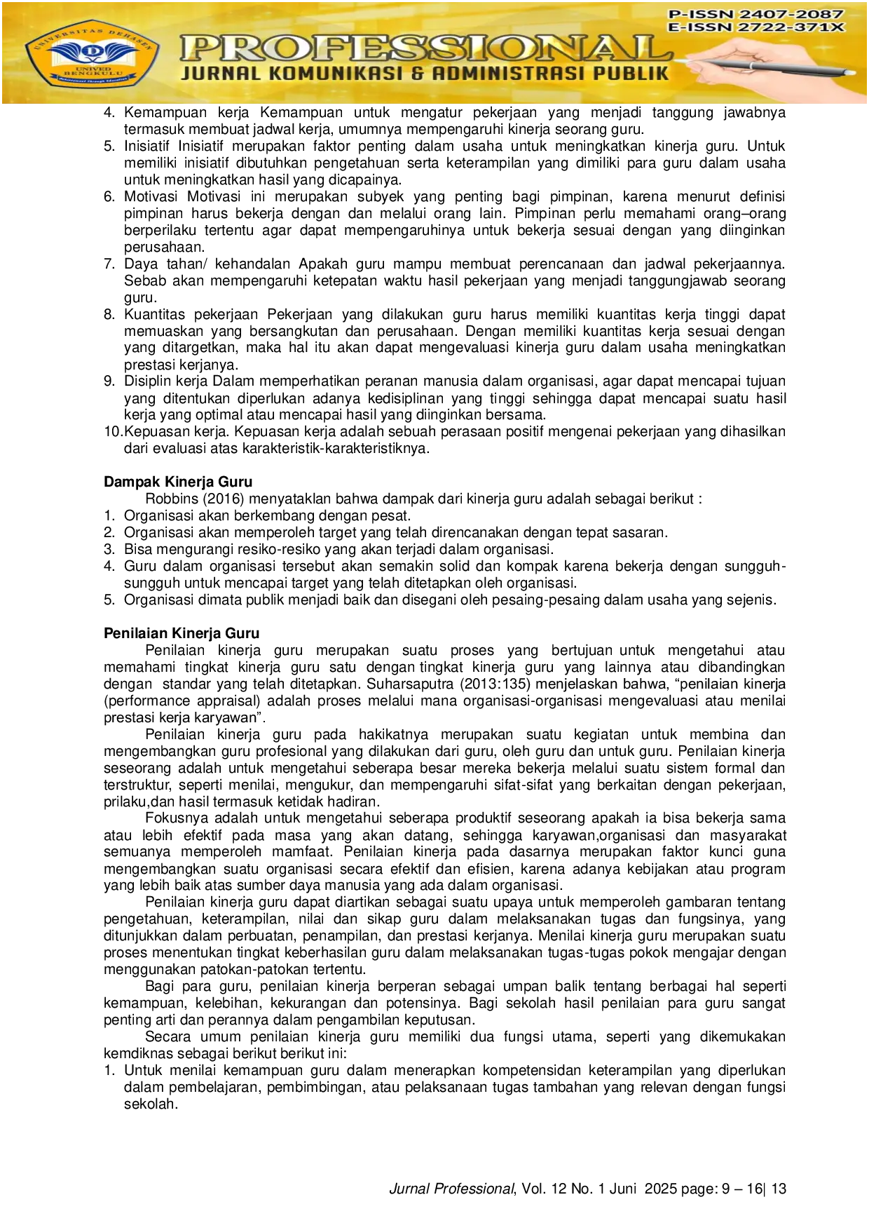 Kesimpulan dari uraian tersebut dapat dijelaskan dalam beberapa poin penting sebagai berikut.Pentingnya Kinerja Guru dalam Pendidikan Kinerja guru memegang peranan penting dalam mencapai tujuan pendidikan yang optimal.Guru tidak hanya berfungsi sebagai pengajar yang mentransfer ilmu, tetapi juga sebagai pendidik yang membentuk karakter dan kepribadian siswa.Oleh karena itu, kualitas kinerja guru harus terus ditingkatkan agar proses belajar mengajar lebih efektif dan menghasilkan siswa yang cakap, aktif, kreatif, dan mandiri.Pengaruh Kinerja Guru terhadap Prestasi Siswa Kinerja guru yang baik dapat menjadi stimulus bagi siswa untuk menyesuaikan diri dengan suasana pembelajaran dan memahami karakteristik siswa dengan lebih baik.Hal ini akan menciptakan lingkungan belajar yang menyenangkan dan meningkatkan prestasi siswa.Peningkatan Kompetensi dan Profesionalisme Guru Kualitas guru, yang dapat diukur melalui kompetensi dan profesionalisme, masih menjadi tantangan di Indonesia.Kompetensi guru mencakup kemampuan menguasai materi, metode, media pembelajaran, serta kemampuan berinteraksi dengan siswa, orang tua, dan masyarakat.Data menunjukkan bahwa kompetensi guru di Indonesia masih rendah, dan ini mempengaruhi kualitas pendidikan secara keseluruhan.Pentingnya Pelatihan dan Pengembangan Guru Untuk meningkatkan kualitas guru, diperlukan pelatihan, pengawasan, dan pengembangan kemampuan yang lebih intensif.Guru yang terus mengembangkan diri melalui pendidikan dan pelatihan akan lebih siap menghadapi tantangan dalam proses belajar mengajar.Model Penelitian Kuantitatif dan Regresional Penelitian yang dilakukan menggunakan pendekatan kuantitatif untuk melihat pengaruh beberapa variabel terhadap kinerja guru.Variabel-variabel tersebut mencakup kepemimpinan partisipatif kepala sekolah, iklim kerja, Organizational Citizenship Behaviour (OCB), komunikasi interpersonal, dan komitmen organisasi.Penelitian ini bertujuan untuk mengetahui seberapa besar pengaruh faktor-faktor tersebut terhadap kinerja guru di Sekolah Dasar Negeri di Kabupaten Tabalong.Definisi Kinerja Kinerja adalah hasil pekerjaan yang dicapai seseorang berdasarkan standar yang telah ditentukan.Menurut berbagai ahli, kinerja dapat dipandang sebagai tingkat pencapaian dalam melaksanakan tugas yang ditugaskan untuk mencapai tujuan organisasi, baik dalam konteks individu maupun tim.Secara keseluruhan, meningkatkan kualitas kinerja guru menjadi kunci utama dalam menciptakan pendidikan yang lebih baik.Peningkatan kompetensi dan profesionalisme guru, serta pengelolaan yang baik terhadap faktor-faktor yang mempengaruhi kinerja, diharapkan dapat membawa kemajuan dalam dunia pendidikan di Indonesia.