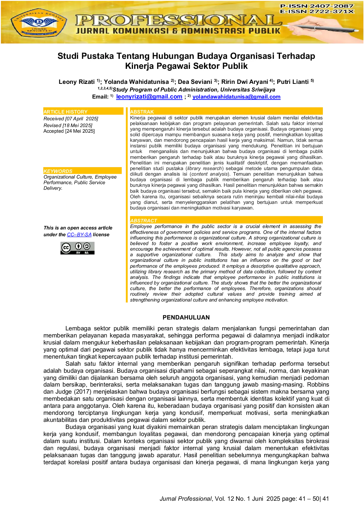 Just a moment...Just a moment...Kinerja pegawai di sektor publik merupakan elemen krusial dalam menilai efektivitas pelaksanaan kebijakan dan program pelayanan pemerintah. Salah satu faktor internal yang mempengaruhi kinerja tersebut adalah budaya organisasi. Budaya organisasi yang solid dipercaya mampu membangun suasana kerja yang positif, meningkatkan loyalitas karyawan, dan mendorong pencapaian hasil kerja yang maksimal. Namun, tidak semua instansi publik memiliki budaya organisasi yang mendukung. Penelitian ini bertujuan untuk menganalisis dan menunjukkan bahwa budaya organisasi di lembaga publik memberikan pengaruh terhadap baik atau buruknya kinerja pegawai yang dihasilkan.