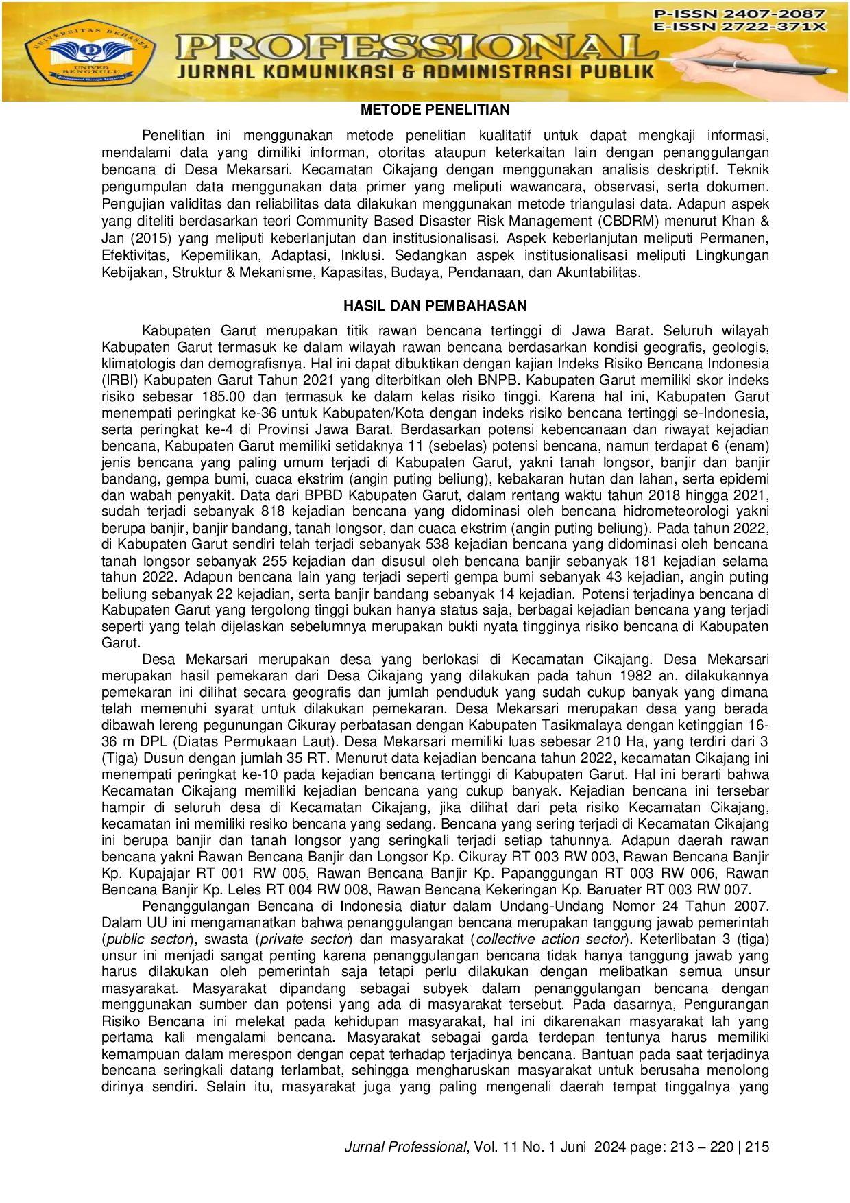 Just a moment...Just a moment...Penelitian ini mengkaji tentang Pengurangan Risiko Bencana di Desa Mekarsari, Kecamatan Cikajang, Kabupaten Garut. Masyarakat yang belum menyadari tentang bahaya bencana serta banyaknya masyarakat yang mengharapkan imbalan dalam penyelenggaraan Pengurangan Risiko Bencana di Desa Mekarsari merupakan permasalahan dalam penelitian ini. Penelitian ini bertujuan untuk mengetahui bagaimana kesiapan Desa Mekarsari dalam upaya Pengurangan Risiko Bencana. Penelitian ini menggunakan teori Khan & Jan (2015) yang mana dalam teori ini memiliki kunci keberhasilan dalam pelaksanaan Pengurangan Risiko Bencana Berbasis Masyarakat. Terdapat 2 unsur keberhasilan yakni keberlanjutan dan Institusionalisasi. Penelitian ini menggunakan metode penelitian kualitatif dengan melibatkan informan yang terlibat dalam pelaksanaan upaya pengurangan risiko bencana di Desa Mekarsari. Hasil penelitian menunjukkan bahwa Pengurangan Risiko Bencana di Desa Mekarsari masih perlu ditingkatkan. Sulitnya mengajak masyarakat dalam berpartisipasi terhadap kegiatan desa, serta kapasitas masyarakat desa yang masih kurang terkait dengan kebencanaan menjadi kendala dalam upaya Pengurangan Risiko Bencana di Desa Mekarsari. Sehingga dapat disimpulkan bahwa Pengurangan Risiko Bencana di Desa Mekarsari sudah terlaksanakan, namun masih memiliki beberapa kendala yang menghambat keberhasilan pengurangan risiko bencana seperti rendahnya kapasitas masyarakat dan partisipasi masyarakat desa yang masih minim.