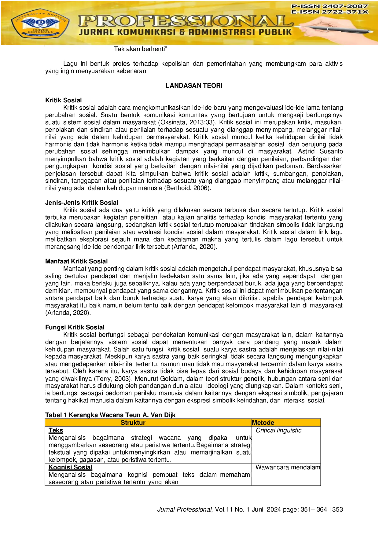 Just a moment...Just a moment...Feast adalah salah satu band yang mengekspresikan kritik sosial melalui lagu mereka. Idealisme dalam pembuatan musik, penggunaan bahasa kiasan, dan tema yang disajikan membuat penulis mempelajari lirik lagu Maju dari Feast dalam penelitian ini. Metode yang digunakan adalah kualitatif. Tujuan penelitian ini adalah memahami makna kritik sosial dalam lagu Maju dengan pendekatan Teun A. Van Dijk. Analisis wacana kritis dengan model Teun A. van Dijk mencakup dimensi teks, kognisi sosial, dan konteks sosial. Dimensi teks akan dianalisis dalam hal Struktur Makro, Superstruktur, dan Struktur Mikro, kemudian dibahas dalam dimensi kognisi sosial dan dimensi konteks sosial untuk menemukan makna kritik sosial dalam lirik lagu Maju. Analisis terhadap data lirik lagu dilakukan untuk menggambarkan makna kritik sosial dalam lirik lagu Maju karya Feast. Hasil penelitian menunjukkan adanya kritik sosial dalam lirik lagu Maju yang dinyanyikan oleh Feast, yaitu sebagai warga negara kita harus memiliki rasa nasionalisme dan perjuangan untuk negara Indonesia. Situasi negara Indonesia yang ingin dipecah belah oleh orang asing tidak boleh dibiarkan terjadi; kita harus tangguh dan berjuang hingga titik darah penghabisan untuk melindungi kedaulatan Republik Indonesia. Keberanian adalah sesuatu yang harus ditanamkan dalam diri setiap orang, dan membela hak yang merupakan milik kita adalah sebuah keharusan.