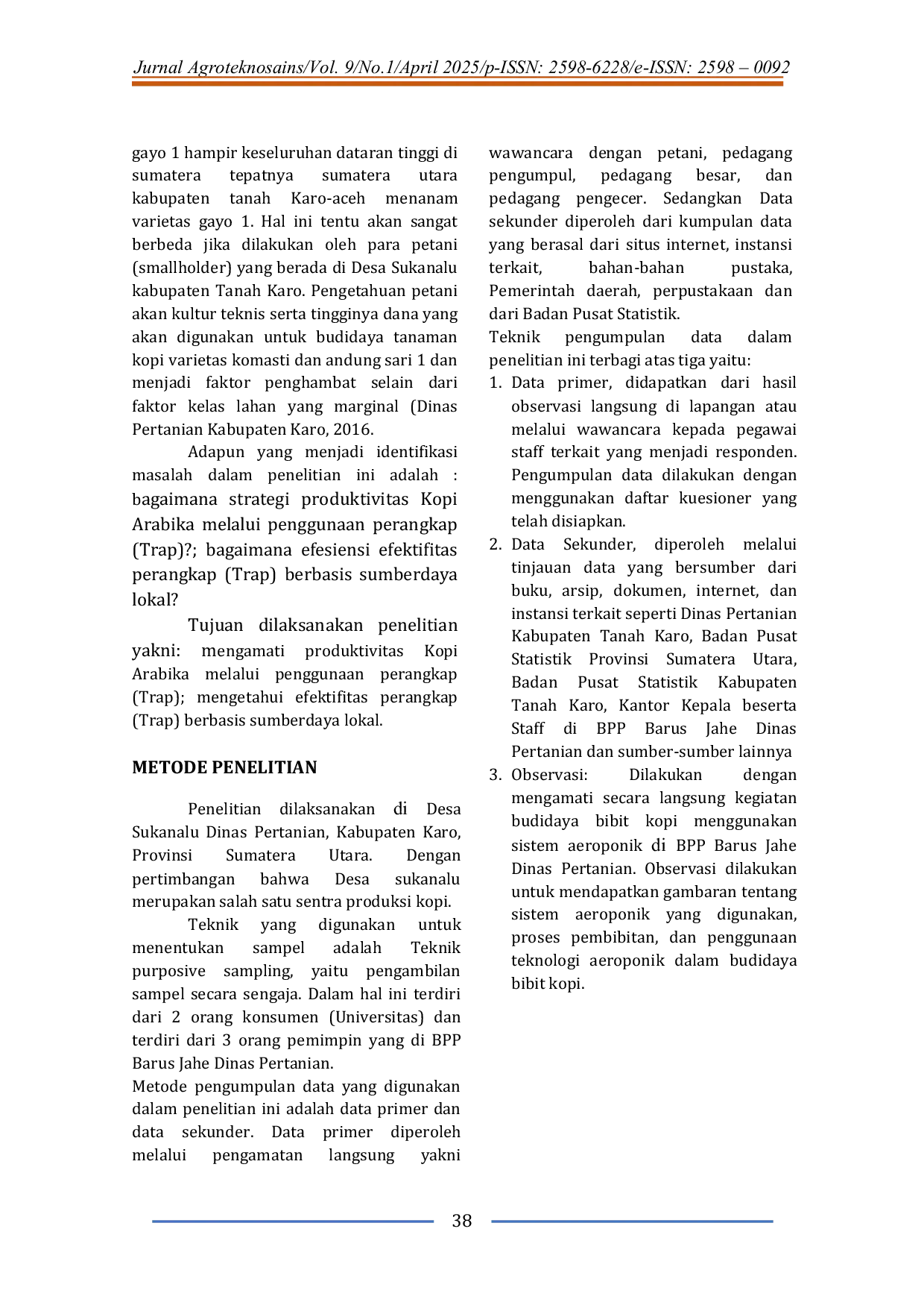 Bad request!Bad request!Kopi merupakan salah satu tanaman perkebunan penting di Indonesia, dan menjadi sumber pendapatan bagi jutaan petani dan keluarganya. Kita semua sebagai petani maupun para konsumen yang biasa meminum kopi dari Indonesia tentu berharap bahwa produksi kopi masih akan berlanjut terus di masa depan. Tanaman Kopi (Coffee Sp) merupakan salah satu tanaman utama di Sumatera Utara yang banyak diusahakan oleh rakyat termasuk Kabupaten Karo. Tanaman ini merupakan komoditi perkebunan yang penting dalam perekonomian daerah Kabupaten Karo karena dapat menyumbangkan devisa untuk daerah ini. Secara umum tanaman kopi tumbuh pada ketinggian 500 m dari permukaan laut dengan suhu rata-rata 21-24 0C dan menghendaki curah hujan 2000 - 3000 mm. Jenis komoditi unggulan yang dibudidayakan masyarakat Kabupaten Karo tahun 2020 adalah tanaman kopi. Komasti merupakan varietas bahan tanam unggul baru kopi Arabika yang telah dilepas oleh Pusat Penelitian Kopi dan Kakao Indonesia pada tahun 2013. Varietas ini mempunyai potensi hasil mencapai ±2,1 ton greenbean per hektar dengan populasi 2.000 tanaman tentu dengan perawatan yang intensif. Untuk menjaga tanaman kopi tetap sehat dan produktif, dianjurkan untuk melakukan pencegahan serangan hama dan penyakit serta mengendalikanya secara benar apabila tanaman telah terserang. Pengendalian hayati dapat dilakukan dengan penyemprotan spora jamur Beauveria bassiana. Biakan Beauveria dapat dibuat sendiri oleh petani atau membeli dari dinas setempat. Sistem pertanian berkelanjutan menawarkan alternatif praktek produksi kopi yang ramah lingkungan dan secara sosial ekonomi menguntungkan. Sistem ini diharapkan dapat memenuhi kebutuhan para petani saat ini tanpa mengabaikan kepentingan anak cucu yang akan datang.