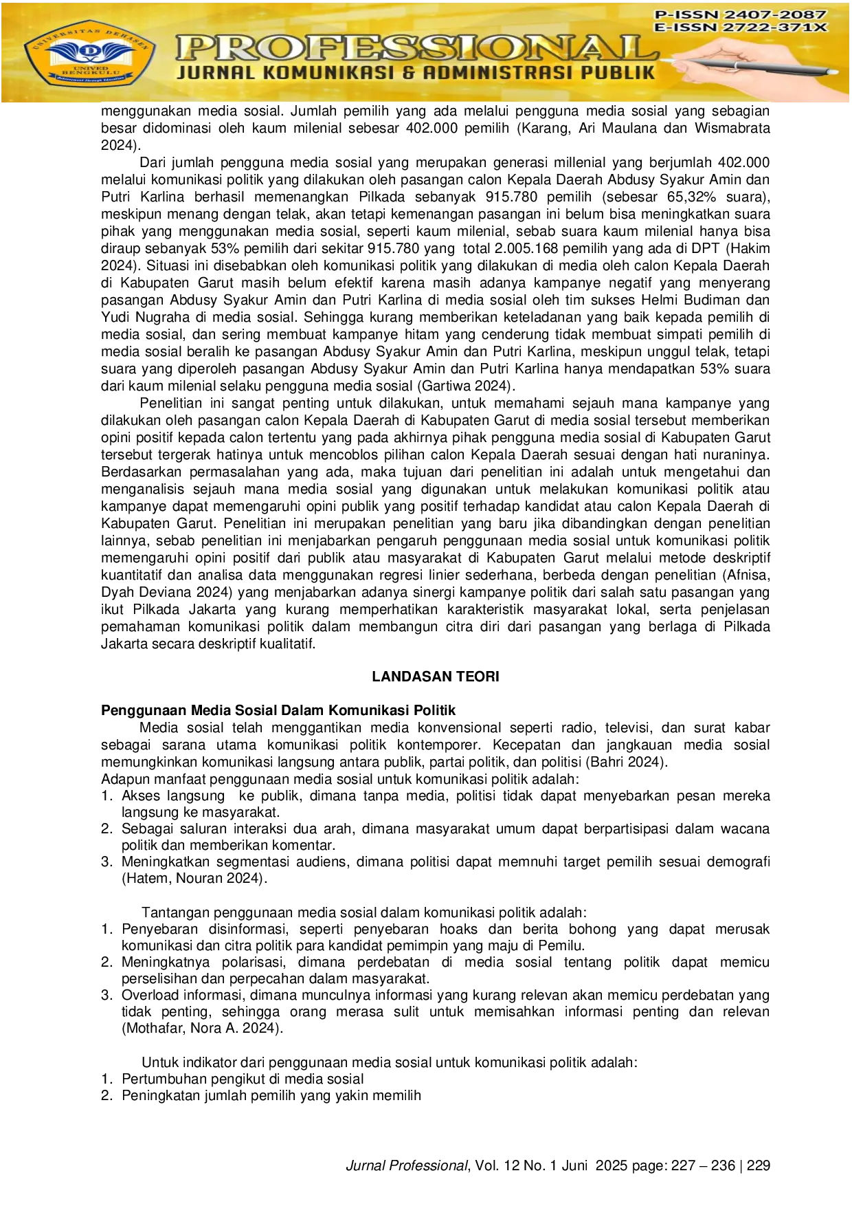 Just a moment...Just a moment...Kabupaten Garut merupakan satu daerah di Jawa Barat yang melaksanakan Pilkada Kepala Daerah Serentak. Jumlah pengguna media sosial yang merupakan generasi millenial yang berjumlah 402.000 melalui komunikasi politik yang dilakukan oleh pasangan calon Kepala Daerah Abdusy Syakur Amin dan Putri Karlina mereka berhasil memenangkan Pilkada sebanyak 915.780 pemilih (sebesar 65% suara). Meskipun menang dengan telak, kemenangan pasangan ini belum bisa meningkatkan suara pihak yang menggunakan media sosial, seperti kaum millenial, dimana suara kaum millenial hanya bisa diraup sebanyak 53% pemilih dari sekitar 915.780 yang total 2.005.168 pemilih yang ada di DPT. Situasi ini disebabkan oleh komunikasi politik yang dilakukan di media oleh calon Kepala Daerah di Kabupaten Garut masih belum efektif karena masih adanya kampanye negatif yang menyerang pasangan Abdusy Syakur Amin dan Putri Karlina di media sosial oleh tim sukses Helmi Budiman dan Yudi Nugraha di media sosial, sehingga kurang memberikan keteladanan yang baik kepada pemilih di media sosial, serta sering membuat kampanye hitam yang cenderung tidak membuat simpati pemilih di media sosial beralih ke pasangan Abdusy Syakur Amin dan Putri Karlina. Tujuan penelitian ini untuk mengetahui dan menganalisis sejauh mana media sosial yang digunakan untuk melakukan komunikasi politik atau kampanye dapat memengaruhi opini publik yang positif terhadap kandidat atau calon Kepala Daerah di Kabupaten Garut. Metode penelitian menggunakan metode deskriptif kuantitatif dengan teknik pengumpulan data menggunakan observasi, kuesioner dan studi pustaka, sedangkan analisis data menggunakan uji kualitas data, uji asumsi klasik, uji regresi linier sederhana, uji t dan uji koefisien determinasi. Hasil penelitian yang ada, dapat disimpulkan bahwa penggunaan media sosial dalam komunikasi politik berpengaruh terhadap opini publik secara positif.