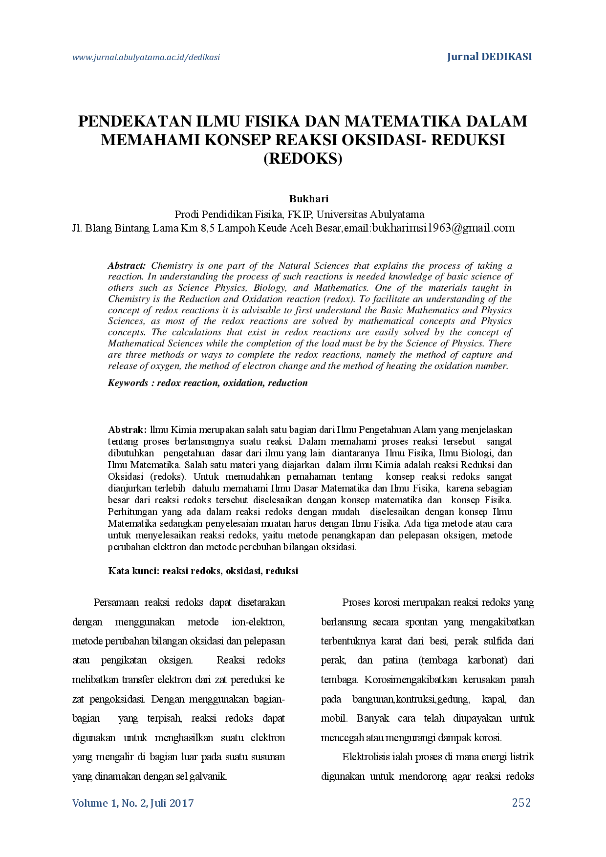 Jurnal Dedikasi PendidikanJurnal Dedikasi PendidikanIlmu Kimia merupakan salah satu bagian dari Ilmu Pengetahuan Alam yang menjelaskan tentang proses berlansungnya suatu reaksi. Dalam memahami proses reaksi tersebut sangat dibutuhkan pengetahuan dasar dari ilmu yang lain diantaranya Ilmu Fisika, Ilmu Biologi, dan Ilmu Matematika. Salah satu materi yang diajarkan dalam ilmu Kimia adalah reaksi Reduksi dan Oksidasi (redoks). Untuk memudahkan pemahaman tentang konsep reaksi redoks sangat dianjurkan terlebih dahulu memahami Ilmu Dasar Matematika dan Ilmu Fisika, karena sebagian besar dari reaksi redoks tersebut diselesaikan dengan konsep matematika dan konsep Fisika. Perhitungan yang ada dalam reaksi redoks dengan mudah diselesaikan dengan konsep Ilmu Matematika sedangkan penyelesaian muatan harus dengan Ilmu Fisika. Ada tiga metode atau cara untuk menyelesaikan reaksi redoks, yaitu metode penangkapan dan pelepasan oksigen, metode perubahan elektron dan metode perebuhan bilangan oksidasi.