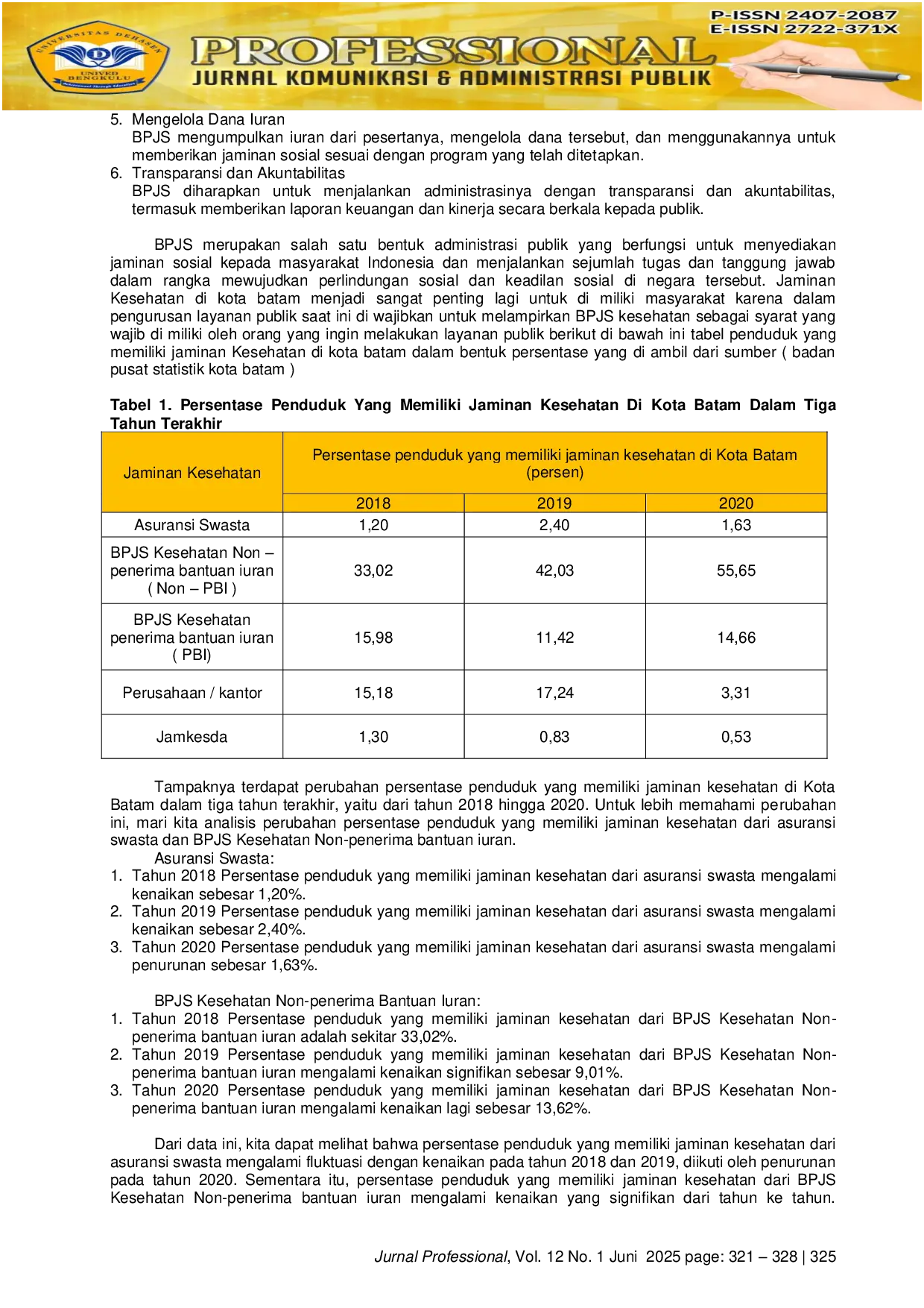 Penelitian ini telah menyoroti dampak penting kebijakan BPJS Kesehatan sebagai syarat wajib administrasi publik di Kota Batam, termasuk adanya pro dan kontra serta beban finansial bagi masyarakat. Untuk memperdalam pemahaman ini, penelitian lanjutan dapat fokus pada beberapa aspek krusial. Pertama, perlu dilakukan studi kuantitatif yang lebih rinci untuk menganalisis secara langsung bagaimana kebijakan ini secara statistik memengaruhi tingkat kepesertaan BPJS Kesehatan di berbagai lapisan masyarakat, khususnya kelompok berpenghasilan rendah, dan apakah fluktuasi data kepemilikan jaminan kesehatan yang terlihat selama ini memang terkait erat dengan pemberlakuan syarat wajib tersebut. Kedua, investigasi kualitatif mendalam dapat mengeksplorasi persepsi, pengalaman, dan strategi adaptasi masyarakat Batam dalam memenuhi kewajiban BPJS Kesehatan untuk mengakses layanan publik, guna mengidentifikasi tantangan spesifik yang dihadapi dan dampak sosial ekonomi yang lebih luas. Terakhir, berdasarkan tantangan finansial yang diuraikan, riset evaluatif terhadap efektivitas berbagai model subsidi atau skema pembayaran iuran BPJS Kesehatan yang disesuaikan dengan kemampuan ekonomi masyarakat sangat penting untuk merumuskan kebijakan yang lebih adil dan berkelanjutan. Ini akan membantu pemerintah kota dalam menemukan solusi optimal untuk mengurangi beban masyarakat kurang mampu, sekaligus memastikan tercapainya target cakupan kesehatan universal di Kota Batam, selaras dengan tujuan program jaminan kesehatan nasional.