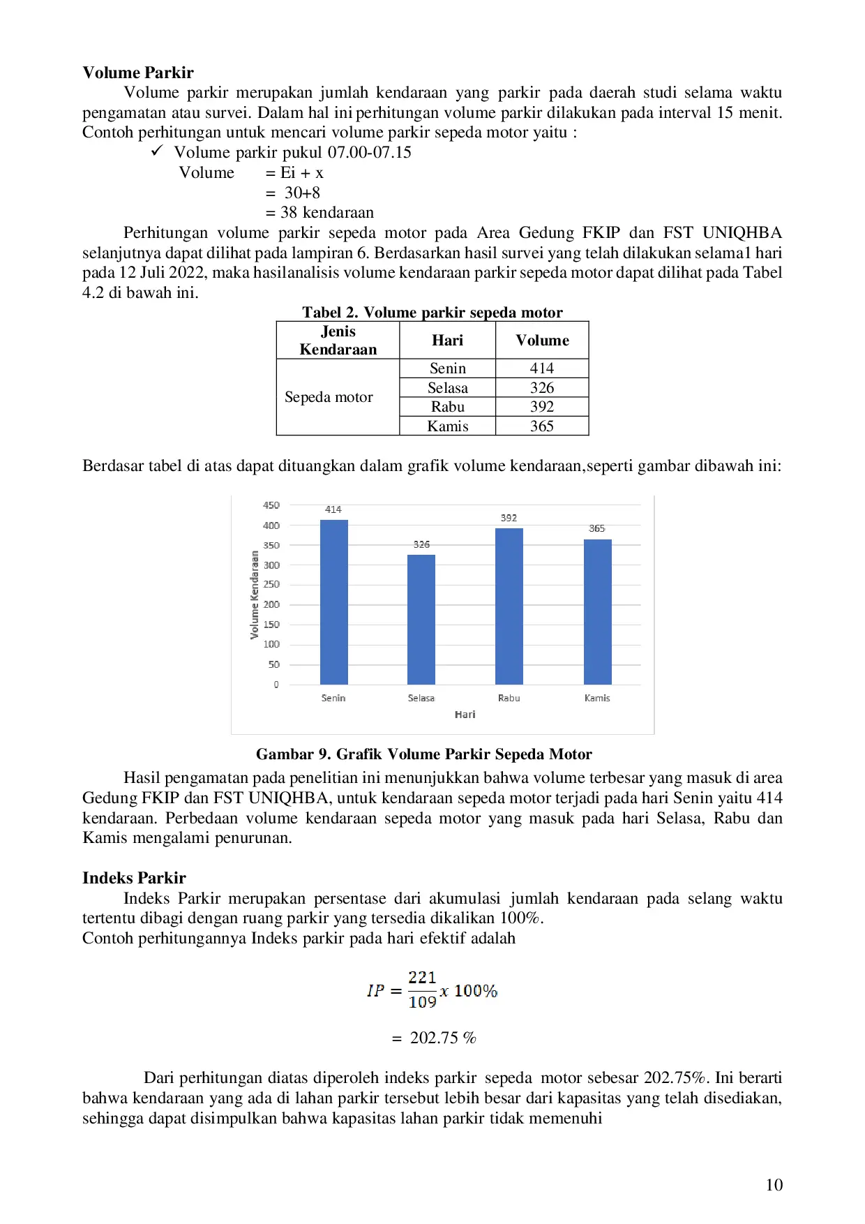 Berdasarkan hasil analisis dan pembahasan, volume parkir maksimum sepeda motor adalah 414 kendaraan.Karakteristik parkir meliputi durasi maksimum 525 menit, akumulasi maksimum 221 kendaraan, indeks parkir 202,75%, turnover parkir 2,04 kali, kapasitas statis 109 SRP, dan okupansi maksimum 202,75%.Kebutuhan ruang parkir (KRP) untuk sepeda motor adalah 243 SRP.Kapasitas lahan parkir sepeda motor yang ada saat ini tidak mencukupi, masih terdapat kekurangan 134 SRP.