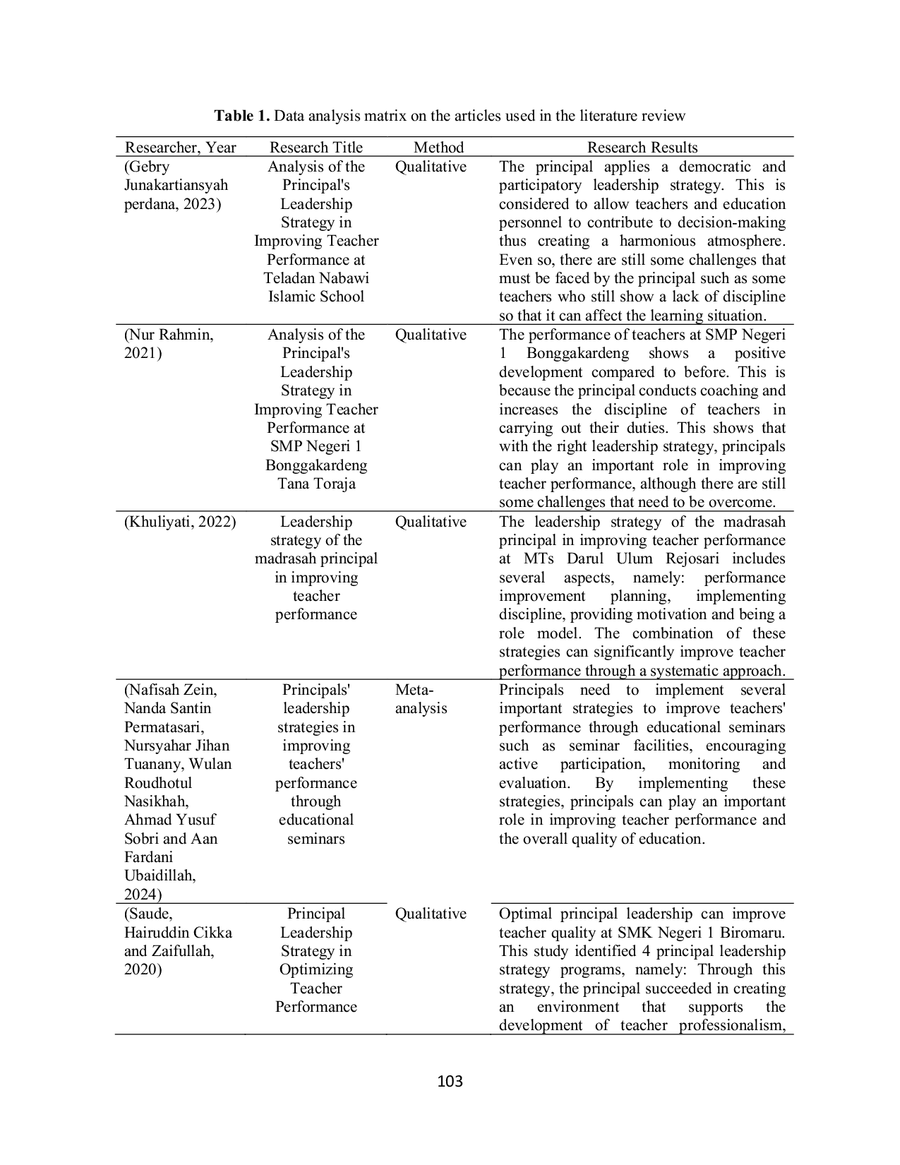 Hasil penelitian menunjukkan bahwa kepemimpinan kepala sekolah memiliki peran sangat penting dalam meningkatkan kinerja guru, di mana strategi kepemimpinan yang efektif dapat mendorong pengembangan profesionalisme guru dan berkontribusi pada keberhasilan pendidikan secara keseluruhan.Kepala sekolah sebagai pemimpin harus mampu menerapkan berbagai program dan pendekatan yang mendukung peningkatan kualitas pembelajaran di sekolah, seperti kepemimpinan instruksional.Kepala sekolah yang memiliki visi dan misi yang jelas dapat menerapkan strategi yang mendukung peningkatan kinerja guru, sehingga menciptakan lingkungan yang kondusif bagi pengembangan profesionalisme guru dan kesuksesan pendidikan secara menyeluruh.