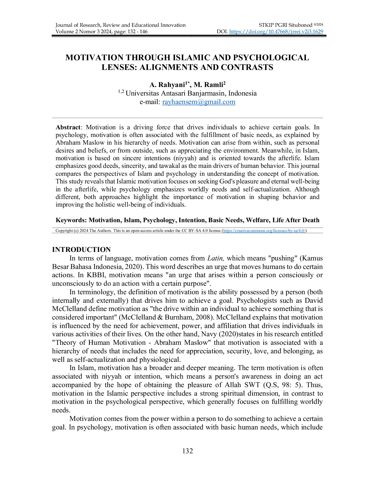 Journal on Research and Review of Educational InnovationJournal on Research and Review of Educational InnovationMotivasi adalah kekuatan yang mendorong individu untuk mencapai tujuan tertentu. Dalam psikologi, motivasi sering dikaitkan dengan pemenuhan kebutuhan dasar, seperti yang dijelaskan oleh Abraham Maslow dalam hierarki kebutuhan. Motivasi dapat muncul dari dalam, seperti keinginan pribadi dan keyakinan, atau dari luar, seperti apresiasi lingkungan. Sementara itu, dalam Islam, motivasi berbasis niat (niyyah) dan berorientasi pada kehidupan akhirat. Islam menekankan amal baik, kesungguhan, dan tawakal sebagai penggerak utama perilaku manusia. Jurnal ini membandingkan perspektif Islam dan psikologi dalam memahami konsep motivasi. Penelitian ini mengungkap bahwa motivasi Islam fokus pada pencapaian keridhaan Allah dan kesejahteraan abadi di akhirat, sedangkan psikologi menekankan kebutuhan dunia dan aktualisasi diri. Meskipun berbeda, kedua pendekatan ini menekankan pentingnya motivasi dalam membentuk perilaku dan meningkatkan kesejahteraan holistik individu.