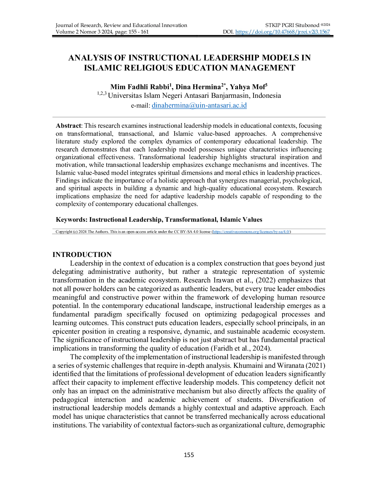 Journal on Research and Review of Educational InnovationJournal on Research and Review of Educational InnovationThis research examines instructional leadership models in educational contexts, focusing on transformational, transactional, and Islamic value-based approaches. A comprehensive literature study explored the complex dynamics of contemporary educational leadership. The research demonstrates that each leadership model possesses unique characteristics influencing organizational effectiveness. Transformational leadership highlights structural inspiration and motivation, while transactional leadership emphasizes exchange mechanisms and incentives. The Islamic value-based model integrates spiritual dimensions and moral ethics in leadership practices. Findings indicate the importance of a holistic approach that synergizes managerial, psychological, and spiritual aspects in building a dynamic and high-quality educational ecosystem. Research implications emphasize the need for adaptive leadership models capable of responding to the complexity of contemporary educational challenges.