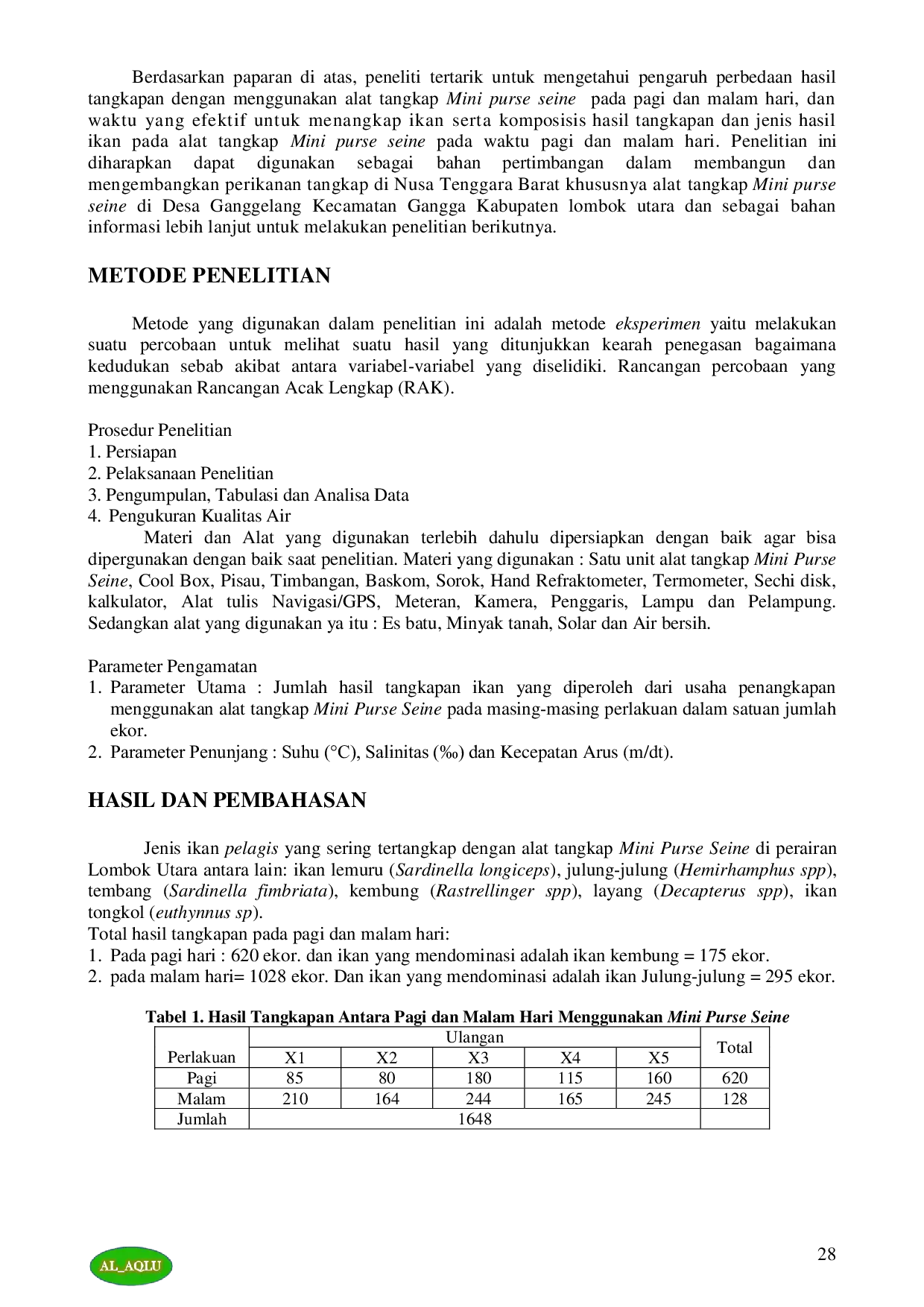 Al-Aqlu: Jurnal Matematika, Teknik dan SainsAl-Aqlu: Jurnal Matematika, Teknik dan SainsPurse seine adalah alat (gear) yang digunakan untuk menangkap ikan pelagis yang membentuk gerombolan. Tujuan dari penelitian ini yaitu 1) untuk mengetahui pengaruh perbedaan hasil tangkapan dengan menggunakan alat tangkap Mini purse seine pada pagi dan malam hari, 2) untuk mengetahui waktu yang paling efektif penangkapan ikan dengan menggunakan alat tangkap Mini Purse Seine., dan 3) Untuk mengetahui komposisis hasil tangkapan dan jenis hasil ikan pada alat tangkap Mini purse seine pada waktu pagi dan malam hari. Metode yang digunakan dalam penelitian ini adalah metode eksperimen dengan rancangan percobaan yang menggunakan rancangan acak lengkap. Penelitian ini dilaksanakan di Perairan Desa Ganggelang Kecamatan Gangga Kabupaten Lombok Utara. Hasil penelitian menunjukkan bahwa tidak ada pengaruh perbedaan hasil tangkapan ikan dengan menggunakan alat tangkap Mini purse seine pada pagi dan malam hari, namun ada perbedaan komposisi hasil tangkapan ikan pada pagi dan malam hari. Hasil tangkapan ikan pada malam hari lebih banyak yaitu : 1.028 ekor sedangkan pada pagi hari sekitar : 620 ekor, sehingga waktu yang efektif unutk penangkapan ikan dengan menggunakan alat tangkap Mini Purse Seine yaitu pada malam hari. Jenis ikan hasil tangkapaan yang paling dominan pada pagi hari yaitu ikan kembung sebanyak 175 ekor dan pada malam hari yaitu ikan julung-julung sebanyak 295 ekor.