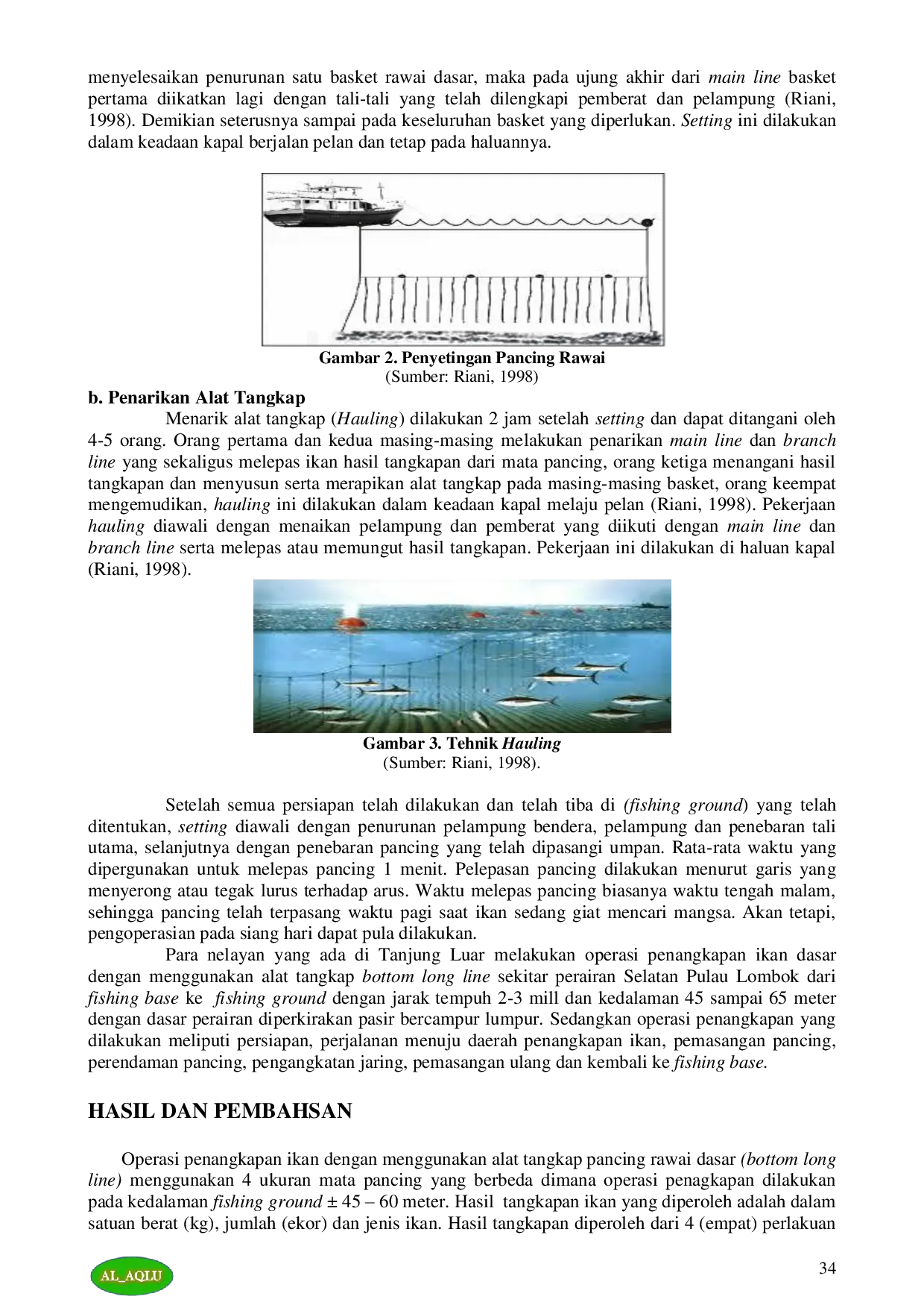 Berdasarkan hasil penelitian, penggunaan mata pancing (hook) yang berbeda pada alat tangkap rawai dasar (bottom long line) memberikan hasil yang berbeda, dengan ukuran mata pancing no.8 lebih produktif dibandingkan ukuran mata pancing no.Hasil tangkapan selama penelitian di Tanjung Luar menunjukkan beberapa jenis ikan yang tertangkap, yaitu ikan Kerapu (Epinephelus sp), Kakap Merah (Lutjanus campechanus), Lencam (Lethrimus lentzam), Kurisi (Nemipterus), Gerot-gerot (Pomadasys macullatus), Alu-alu (Aphyraena genie), Remang (Congresak talabon), dan Cucut (Cucarcarhinus sp).
