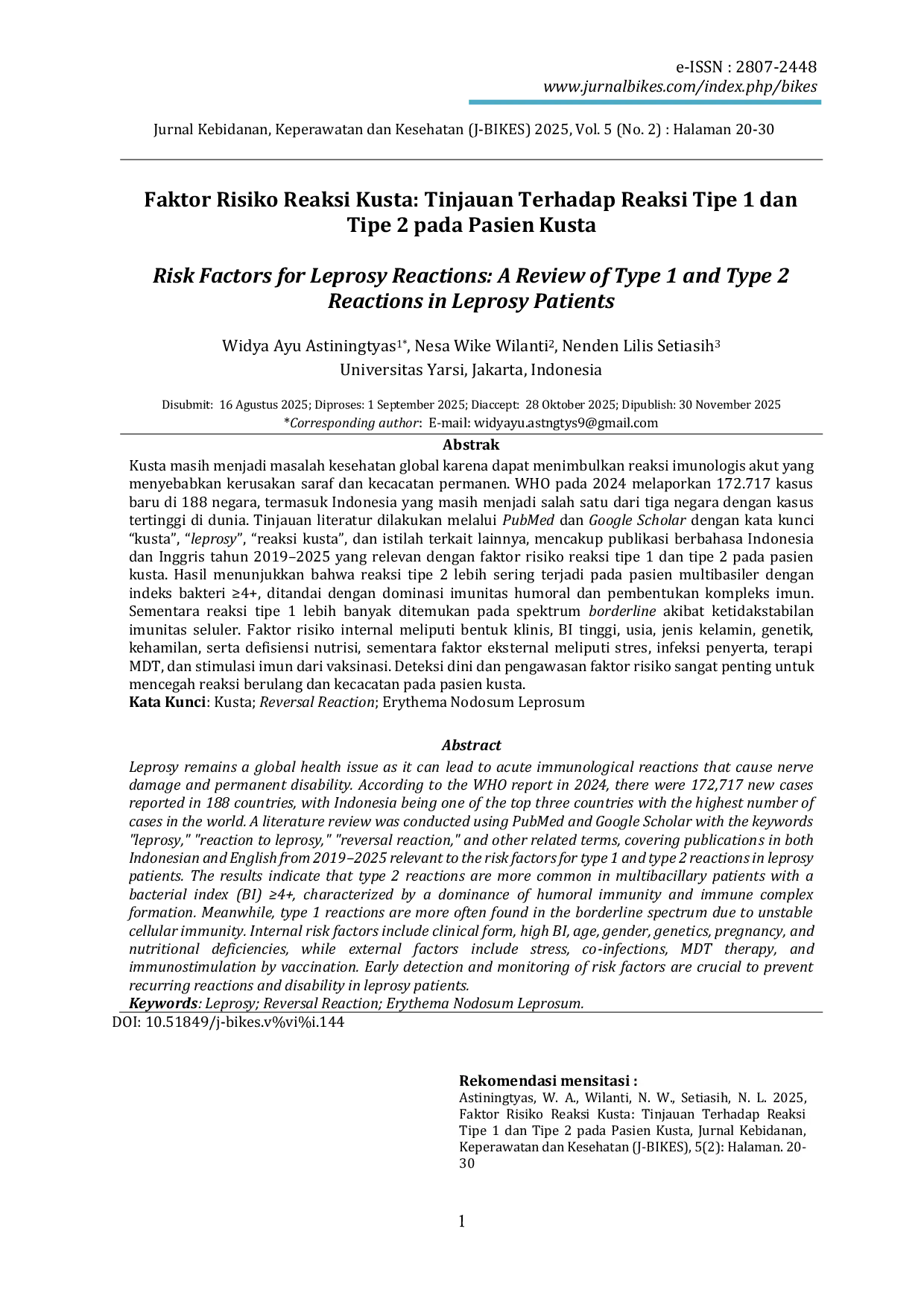 JURNAL KEBIDANAN, KEPERAWATAN DAN KESEHATAN (BIKES)JURNAL KEBIDANAN, KEPERAWATAN DAN KESEHATAN (BIKES)Kusta masih menjadi masalah kesehatan global karena dapat menimbulkan reaksi imunologis akut yang menyebabkan kerusakan saraf dan kecacatan permanen. WHO pada 2024 melaporkan 172.717 kasus baru di 188 negara, termasuk Indonesia yang masih menjadi salah satu dari tiga negara dengan kasus tertinggi di dunia. Tinjauan literatur dilakukan melalui PubMed dan Google Scholar dengan kata kunci “kusta, “leprosy, “reaksi kusta, dan istilah terkait lainnya, mencakup publikasi berbahasa Indonesia dan Inggris tahun 2019–2025 yang relevan dengan faktor risiko reaksi tipe 1 dan tipe 2 pada pasien kusta. Hasil menunjukkan bahwa reaksi tipe 2 lebih sering terjadi pada pasien multibasiler dengan indeks bakteri ≥4 , ditandai dengan dominasi imunitas humoral dan pembentukan kompleks imun. Sementara reaksi tipe 1 lebih banyak ditemukan pada spektrum borderline akibat ketidakstabilan imunitas seluler. Faktor risiko internal meliputi bentuk klinis, BI tinggi, usia, jenis kelamin, genetik, kehamilan, serta defisiensi nutrisi, sementara faktor eksternal meliputi stres, infeksi penyerta, terapi MDT, dan stimulasi imun dari vaksinasi. Deteksi dini dan pengawasan faktor risiko sangat penting untuk mencegah reaksi berulang dan kecacatan pada pasien kusta.