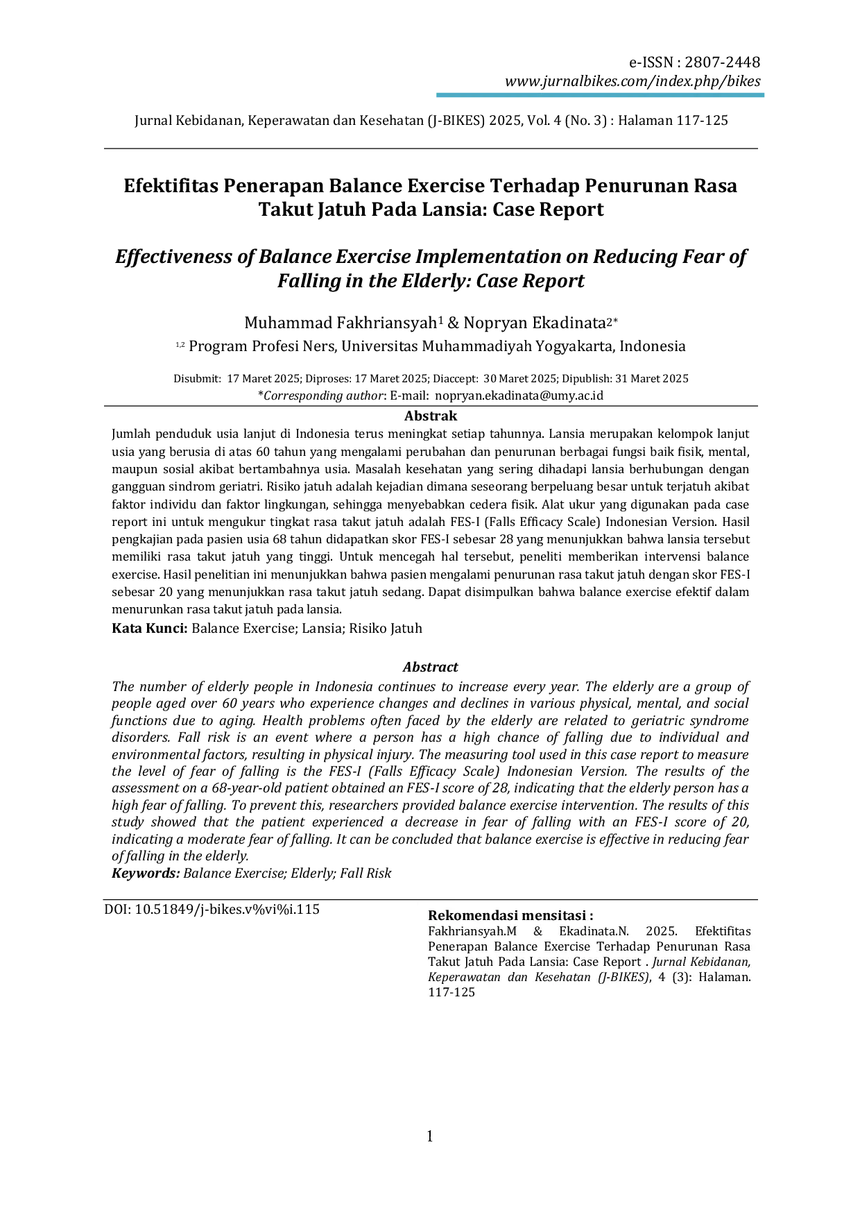 JURNAL KEBIDANAN, KEPERAWATAN DAN KESEHATAN (BIKES)JURNAL KEBIDANAN, KEPERAWATAN DAN KESEHATAN (BIKES)Jumlah penduduk usia lanjut di Indonesia terus meningkat setiap tahunnya. Lansia merupakan kelompok lanjut usia yang berusia di atas 60 tahun yang mengalami perubahan dan penurunan berbagai fungsi baik fisik, mental, maupun sosial akibat bertambahnya usia. Masalah kesehatan yang sering dihadapi lansia berhubungan dengan gangguan sindrom geriatri. Risiko jatuh adalah kejadian dimana seseorang berpeluang besar untuk terjatuh akibat faktor individu dan faktor lingkungan, sehingga menyebabkan cedera fisik. Alat ukur yang digunakan pada case report ini untuk mengukur tingkat rasa takut jatuh adalah FES-I (Falls Efficacy Scale) Indonesian Version. Hasil pengkajian pada pasien usia 68 tahun didapatkan skor FES-I sebesar 28 yang menunjukkan bahwa lansia tersebut memiliki rasa takut jatuh yang tinggi. Untuk mencegah hal tersebut, peneliti memberikan intervensi balance exercise. Hasil penelitian ini menunjukkan bahwa pasien mengalami penurunan rasa takut jatuh dengan skor FES-I sebesar 20 yang menunjukkan rasa takut jatuh sedang. Dapat disimpulkan bahwa balance exercise efektif dalam menurunkan rasa takut jatuh pada lansia.