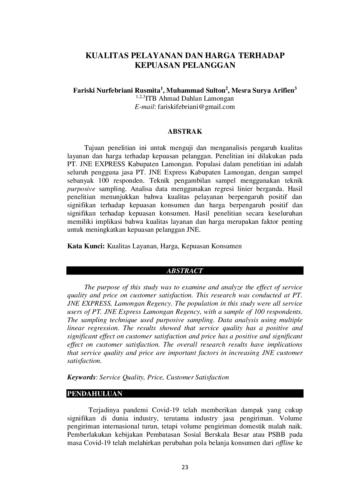 Jurnal Media Komunikasi Ilmu EkonomiJurnal Media Komunikasi Ilmu EkonomiTujuan penelitian ini untuk menguji dan menganalisis pengaruh kualitas layanan dan harga terhadap kepuasan pelanggan. Penelitian ini dilakukan pada PT. JNE EXPRESS Kabupaten Lamongan. Populasi dalam penelitian ini adalah seluruh pengguna jasa PT. JNE Express Kabupaten Lamongan, dengan sampel sebanyak 100 responden. Teknik pengambilan sampel menggunakan teknik purposive sampling. Analisa data menggunakan regresi linier berganda. Hasil penelitian menunjukkan bahwa kualitas pelayanan berpengaruh positif dan signifikan terhadap kepuasan konsumen dan harga berpengaruh positif dan signifikan terhadap kepuasan konsumen. Hasil penelitian secara keseluruhan memiliki implikasi bahwa kualitas layanan dan harga merupakan faktor penting untuk meningkatkan kepuasan pelanggan JNE.