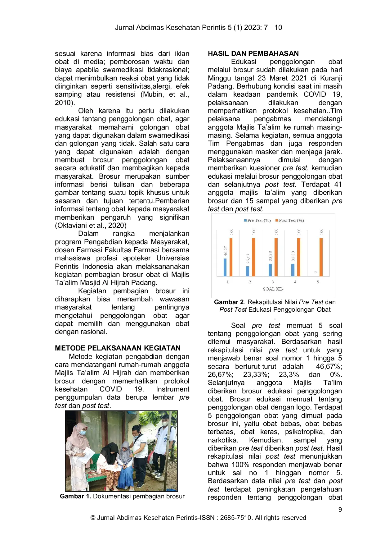 JURNAL ABDIMAS KESEHATAN PERINTISJURNAL ABDIMAS KESEHATAN PERINTISSwamedikasi penggunanan obat sering menjadi alternatif pengobatan yang dipilih masyarakat untuk menghemat biaya konsultasi ke dokter. Namun, pemilihan obat yang tidak rasional dapat memberikan dampak negatif bagi kesehatan. Edukasi tentang penggolongan obat melalui brosur merupakan salah satu solusi yang dapat dilakukan untuk menambah wawasan masyarakat tentang penggolongan obat. Sasaran utama dalam pengabdian ini adalah anggota Majlis Talim, Al Hijrah Kuranji Padang. Pemanfaatan brosur sebagai media informasi dan komunikasi memiliki kelebihan karena dapat menjangkau sasaran yang lebih banyak dan tersebar jauh jika dibandingkan dengan komunikasi tatap muka. Materi yang disajikan pada brosur adalah tentang penggolongan obat. Metode yang dilakukan adalah mendatangi rumah anggota Majlis Talim dan memberikan brosur tentang penggolongan obat dengan memperhatikan protokol kesehatan COVID 19. Instrumen pengumpulan data adalah lembar pre test dan post test. Berdasarkan kegiatan yang telah dilakukan dapat disimpulkan bahwa pemberian brosur meningkatkan pengetahuan anggota majelis Taalim Al Hirah tentang penggolongan obat.