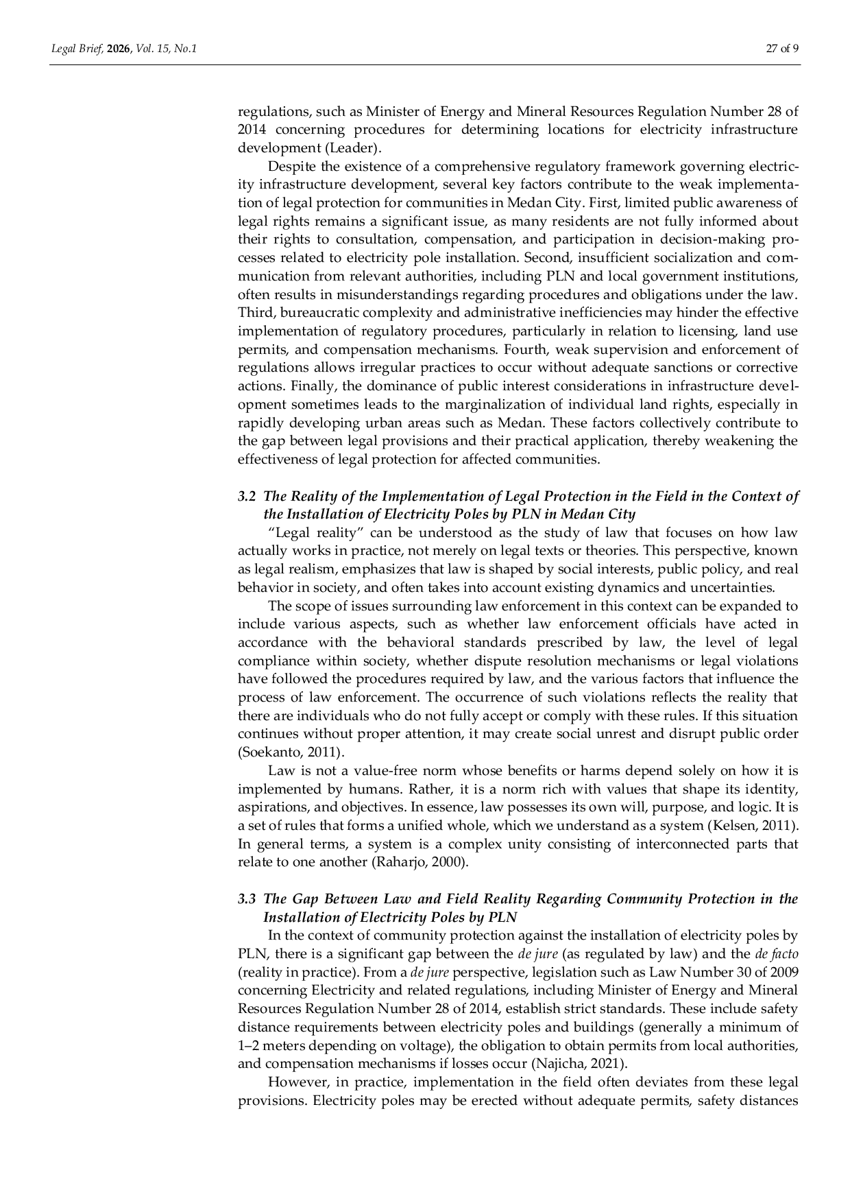 LEGAL BRIEFLEGAL BRIEFThis study examines the legal protection perceived by the people of Medan City regarding the installation of electricity poles, with a focus on the company responsible for installing them, namely the State Electricity Company (PLN). The background of this research is based on the limited public knowledge of legal provisions governing both corporate and state authority, as well as the inconsistency between electricity infrastructure development and citizens land rights and safety guarantees. These conditions often lead to problems such as land disputes or disturbances caused by electricity poles located on privately owned property. The purpose of this study is to analyze the forms of legal protection regulated under Law Number 30 of 2009 on Electricity and to identify the obstacles and solutions in its implementation in Medan City. This research uses an empirical juridical approach with a case study method, involving the analysis of legal documents, interviews with residents to examine the reality of legal protection, interviews with company representatives to understand the actual mechanisms for pole installation and the protection measures applied, and direct field observations at pole installation sites. The results of the study indicate that the reality of legal protection for residents remains relatively weak, particularly in the processes of permit management and the fulfillment of compensation. This is reflected in cases involving PLN that have generated public complaints regarding a lack of transparency and limited public participation. The study concludes that there is a need to educate the community to participate more actively and to improve their understanding of legal protection as consumers, as well as to recognize the gap between regulatory frameworks and their practical implementation in providing legal protection.