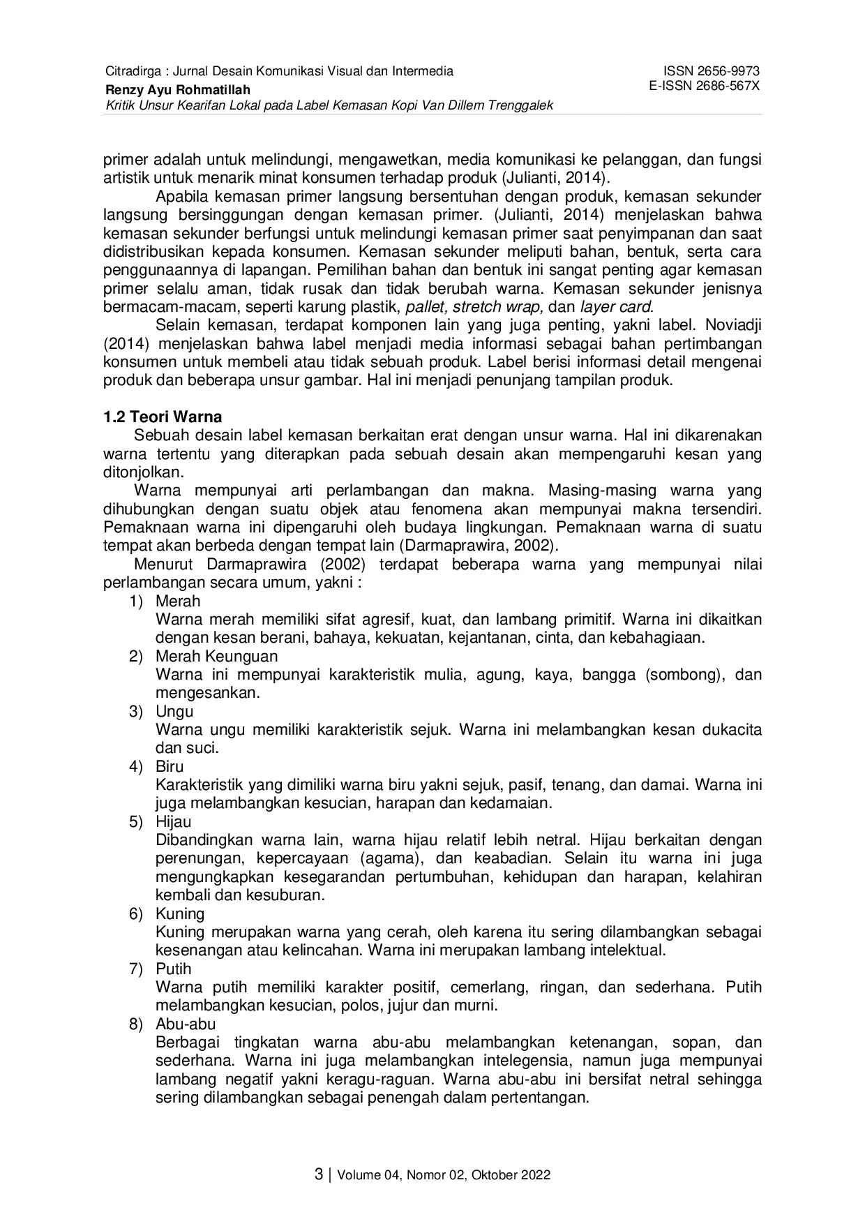 Citradirga : Jurnal Desain Komunikasi Visual dan IntermediaCitradirga : Jurnal Desain Komunikasi Visual dan IntermediaPenelitian ini mengkaji pemaknaan visual label kemasan kopi Van Dillem. Kopi ini merupakan produk daerah Trenggalek. Label kemasan produk ini dikaji untuk mengetahui bagaimana makna visualnya dan apakah makna visual tersebut berkaitan dengan kearifan lokal daerah Trenggalek. Penelitian ini menggunakan teknik pengumpulan data studi pustaka dan observasi. Penelitian ini menggunakan teori kritik seni Feldman yang mencakup empat tahap yakni deskripsi, analisis, interpretasi, dan evaluasi. Sebagai produk khas daerah Trenggalek, kopi Van Dillem membawa nama daerah untuk diperkenalkan kepada masyarakat luas. Cerminan ciri khas daerah dapat ditampilkan pada elemen-elemen visual label kemasan produk lokal untuk menegaskan wilayah produksinya. Hasil penelitian menunjukkan bahwa makna visual label kemasan produk kopi ini menampilkan unsur gambar kolonialisme. Unsur kolonialisme ini berhubungan dengan sejarah terciptanya produk kopi di Trenggalek.