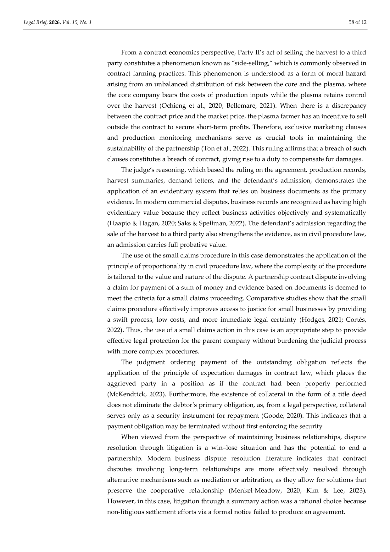 LEGAL BRIEFLEGAL BRIEFPenelitian ini bertujuan untuk membahas resolusi hukum pelanggaran kontrak dalam perjanjian kemitraan bisnis, khususnya dalam hubungan kerjasama bisnis antara pihak-pihak yang memiliki kewajiban kontrak. Perjanjian kemitraan merupakan instrumen hukum yang penting dalam kegiatan ekonomi modern karena mengatur hak dan kewajiban pihak-pihak serta memberikan kepastian hukum dalam hubungan bisnis. Namun, dalam prakteknya, pelanggaran kontrak sering terjadi dan menyebabkan kerugian bagi salah satu pihak. Penelitian ini menggunakan metode penelitian hukum normatif dengan pendekatan statuta dan pendekatan konseptual melalui analisis doktrin hukum, peraturan perundang-undangan, dan putusan pengadilan yang relevan. Hasil penelitian menunjukkan bahwa pelanggaran kontrak dalam kemitraan dapat berupa kegagalan dalam pelaksanaan, keterlambatan dalam pelaksanaan, atau pelaksanaan yang tidak sesuai dengan ketentuan dalam perjanjian. Kondisi-kondisi ini dapat menyebabkan kerugian materiil dan immateriil bagi pihak yang dirugikan. Dalam hukum perdata Indonesia, pihak yang dirugikan dapat mencari kompensasi melalui mekanisme resolusi sengketa, baik melalui litigasi atau non-litigasi. Oleh karena itu, kejelasan klausul kontrak dan mekanisme resolusi sengketa yang disepakati adalah faktor-faktor penting dalam memberikan kepastian hukum dan mencegah konflik dalam hubungan kemitraan bisnis.