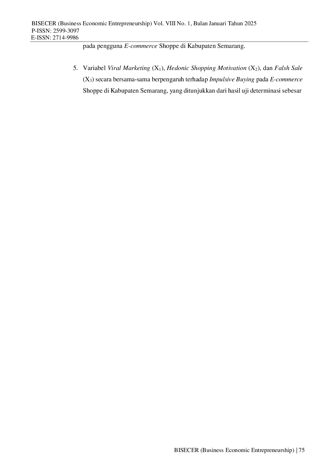 Berdasarkan hasil penelitian, dapat disimpulkan bahwa Viral Marketing memiliki hubungan yang “sangat lemah terhadap Impulsive Buying, Hedonic Shopping Motivation memiliki hubungan yang “sedang terhadap Impulsive Buying, dan Flash Sale memiliki hubungan yang “sedang terhadap Impulsive Buying.Secara simultan, Viral Marketing, Hedonic Shopping Motivation, dan Flash Sale berpengaruh signifikan terhadap Impulsive Buying pada pengguna E-commerce Shopee di Kabupaten Semarang.Variabel-variabel tersebut menjelaskan 24,8% variasi Impulsive Buying, sementara sisanya 75,2% dipengaruhi oleh faktor lain di luar penelitian ini.