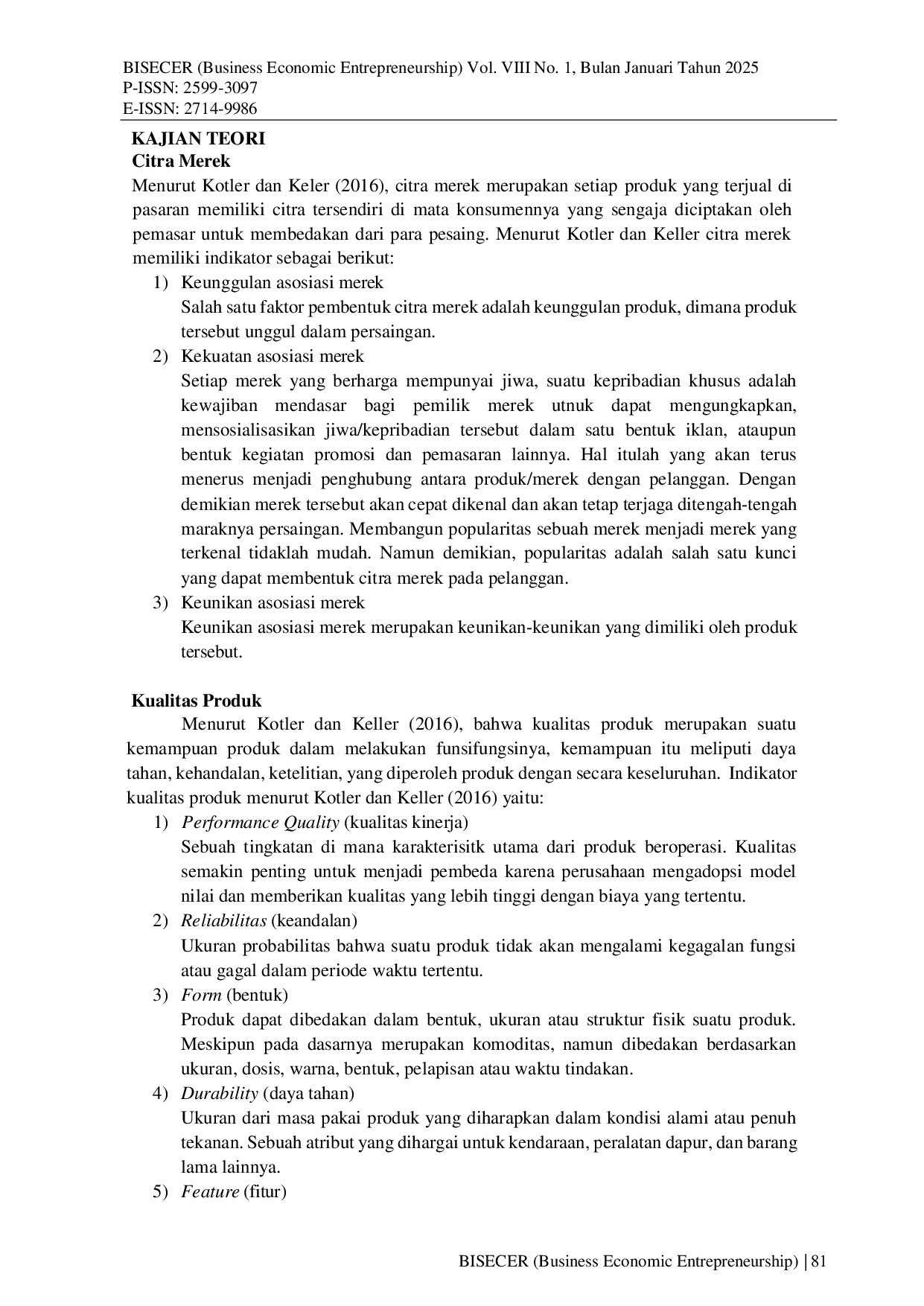 BISECER (Business Economic Entrepreneurship)BISECER (Business Economic Entrepreneurship)Penelitian ini bertujuan untuk mengetahui pengaruh citra merek, kualitas produk, dan gaya hidup hedonis terhadap keputusan pembelian busana muslim Rabbani di Kabupaten Semarang. Metode penelitian yang digunakan adalah metode penelitian kuantitatif dengan menggunakan metode non probability sampling atau lebih tepatnya dengan Teknik purposive sampling. Sampel yang digunakan dalam penelitian ini sebanyak 98 responden dengan kriteria pernah membeli dan pengguna busana muslim Rabbani di Kabupaten Semarang. Sampel yang diambil dengan menggunakan kuesioner yang disebar melalui google form, data dari penelitian ini diolah dan dianalisis menggunakan uji korelasi sederhana, uji korelasi berganda, analisis regresi sederhana, analisis regresi berganda, koefisien deteriminasi, dan uji hipotesis.