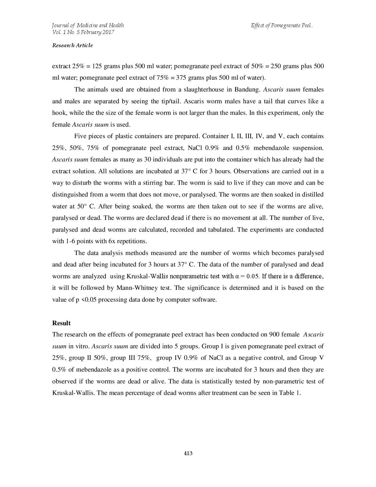 Journal of Medicine and HealthJournal of Medicine and HealthHelminths infections caused by Soil-Transmitted Helminths (STH) are found in many people living in developing countries, especially in rural areas. People often use pomegranate as an anthelmintic. The aim of this research is to find out the effects of pomegranate peel (Punica granatum L.) as an anthelmintic to female Ascaris suum in vitro. The research on the effects of pomegranate peel extract has been conducted on 900 female Ascaris suum in vitro. Ascaris suum are divided into 5 groups, group I: pomegranate peel extract of dose 25%, group II: pomegranate peel extract of 50%, group III: pomegranate peel extract of 75%, group IV: 0.9% NaCl as a negative control, and group V is given mebendazole 0.5% as a positive control. The mean percentage of dead worms in group I is 39%, in group II 61%, while in group III 82%, but its potential is lower than mebendazole, which kills 100%. The treatment using pomegranate peel extract of 25%, 50% and 75% respectively has significant differences with p < 0.05 against negative control (NC) using a 0.9% NaCl. The research concludes that the pomegranate peel extract has an anthelmintic effect against Ascaris suum females in vitro.