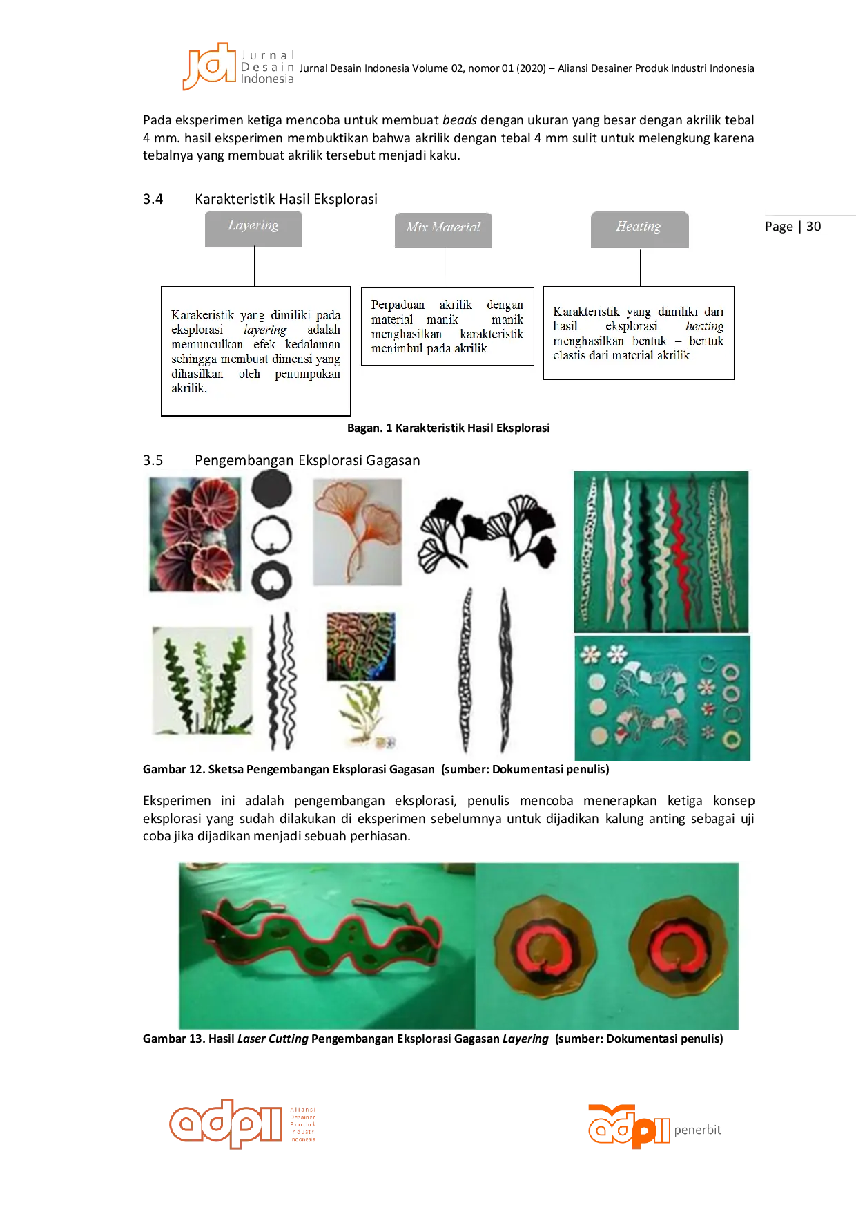 Jurnal Desain Indonesia.Jurnal Desain Indonesia.Material akrilik memiliki karakteristik unik untuk dijadikan bahan produk perhiasan dengan bentuk dan warna yang bervariasi dan tersedia di pasaran. Industri perhiasan banyak memakai bahan baku akrilik dalam proses pembuatan perhiasan dengan memanfaatkan berbagai variasi modul (beads) yang tersebar luas di pasaran. Ketergantungan industri perhiasan dengan modul yang tersedia, menjadikan banyak sekali industri perhiasan berbahan akrilik yang muncul sehingga persaingannya mengandalkan relasi seperti berkolaborasi dengan brand lokal dan mengikuti fashion show untuk berkembang di pasar. Namun hal tersebut menjadi peluang untuk mengembangkan produk perhiasan berbahan akrilik dengan memanfaatkan teknologi laser cutting dalam proses berkreasi (desain) lalu dikembangkan menjadi modul baru. Pendekatan eksplorasi bentuk sangat tepat untuk dilakukan untuk mengembangkan desain perhiasan dengan variasi modul baru dengan memproduksi dan mendesain modul itu sendiri, sehingga desainer tidak bergantung pada modul yang ada.