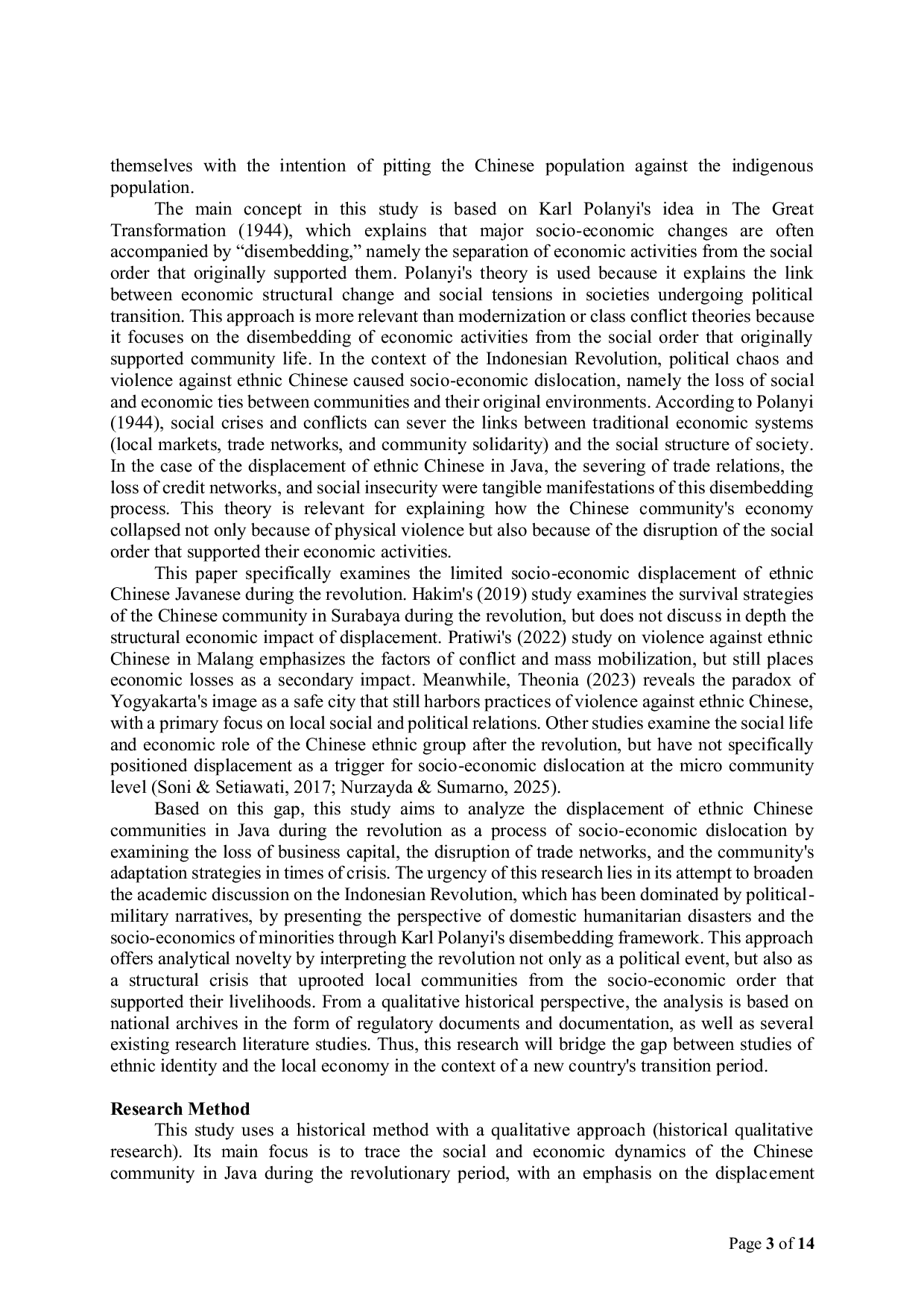 Fajar Historia: Jurnal Ilmu Sejarah dan PendidikanFajar Historia: Jurnal Ilmu Sejarah dan PendidikanThe journey towards Indonesian independence not only fostered a spirit of nationalism but also revealed a dark side in the form of social suffering among the people. One of the forgotten tragedies was the displacement of ethnic Chinese communities in Java, who lost their homes, jobs, and sense of security amid the political turmoil of the revolutionary period. This study aims to explain the social and economic dislocation experienced by the Chinese community as part of a domestic humanitarian disaster. The approach used is a historical method with qualitative analysis based on archival sources, government reports, and contemporary documents. The results of the study show that the displacement was not merely the result of ethnic conflict, but a reflection of a power vacuum and widespread socio-economic tensions. Despite suffering great losses, the Chinese community was able to survive through internal solidarity, community assistance, and adaptation to the new post-war economic structure. This study confirms that the struggle for independence not only brought about political freedom but also left deep social wounds for Indonesian civilians, including those who had been an integral part of Javanese society. This research offers a new perspective by integrating colonial archival sources, visual data, and Karl Polanyis disembedding theory to understand displacement as a form of domestic socio-economic disaster during the revolution, a theme that has not been widely discussed in Indonesian historiography.
