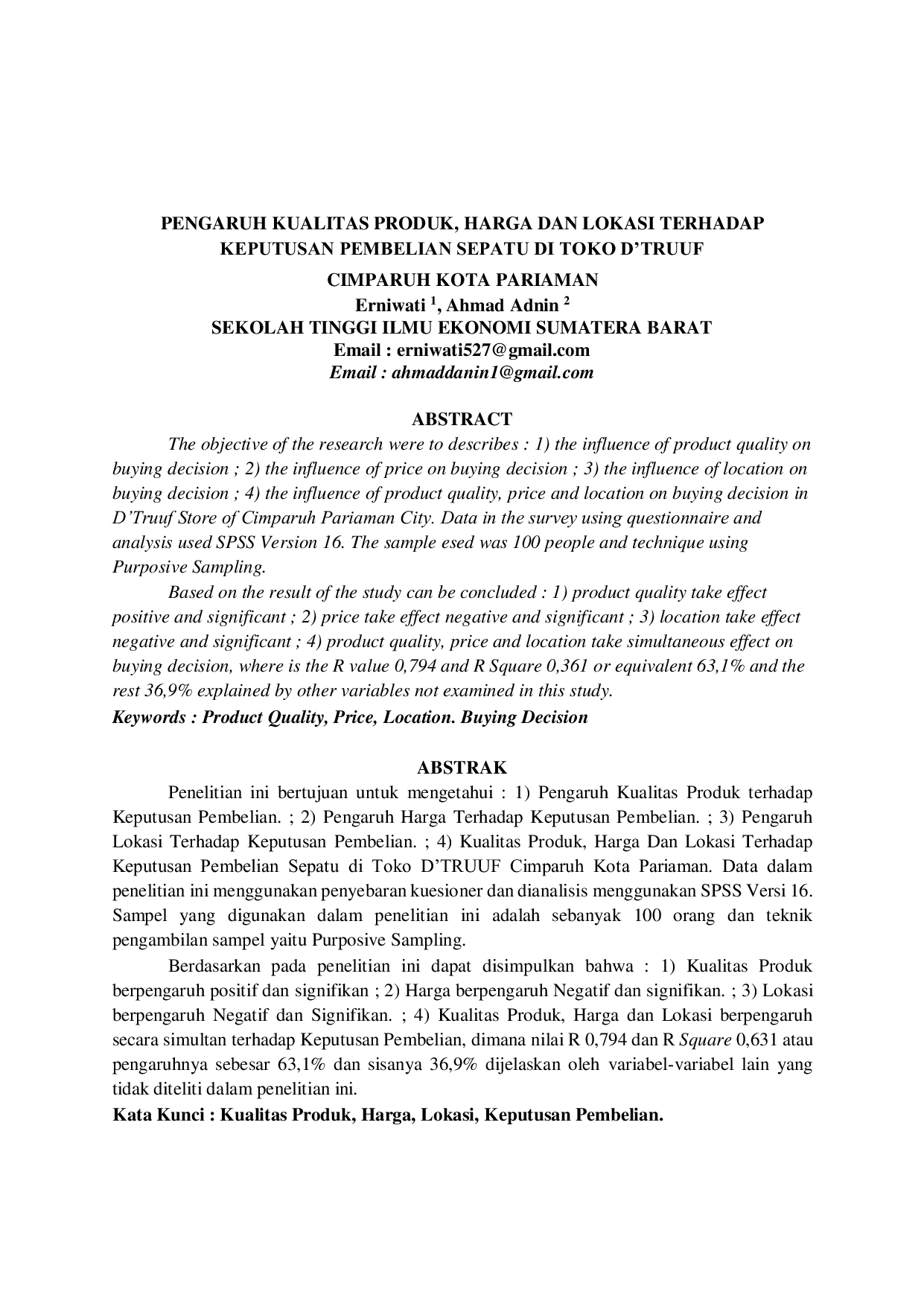 One moment, please...One moment, please...Penelitian ini bertujuan untuk mengetahui : 1) Pengaruh Kualitas Produk terhadap Keputusan Pembelian; 2) Pengaruh Harga Terhadap Keputusan Pembelian; 3) Pengaruh Lokasi Terhadap Keputusan Pembelian; 4) Kualitas Produk, Harga Dan Lokasi Terhadap Keputusan Pembelian Sepatu di Toko DTRUUF Cimparuh Kota Pariaman. Data dalam penelitian ini menggunakan penyebaran kuesioner dan dianalisis menggunakan SPSS Versi 16. Sampel yang digunakan dalam penelitian ini adalah sebanyak 100 orang dan teknik pengambilan sampel yaitu Purposive Sampling. Berdasarkan pada penelitian ini dapat disimpulkan bahwa : 1) Kualitas Produk berpengaruh positif dan signifikan; 2) Harga berpengaruh Negatif dan signifikan; 3) Lokasi berpengaruh Negatif dan Signifikan; 4) Kualitas Produk, Harga dan Lokasi berpengaruh secara simultan terhadap Keputusan Pembelian, dimana nilai R 0,794 dan R Square 0,631 atau pengaruhnya sebesar 63,1% dan sisanya 36,9% dijelaskan oleh variabel-variabel lain yang tidak diteliti dalam penelitian ini.