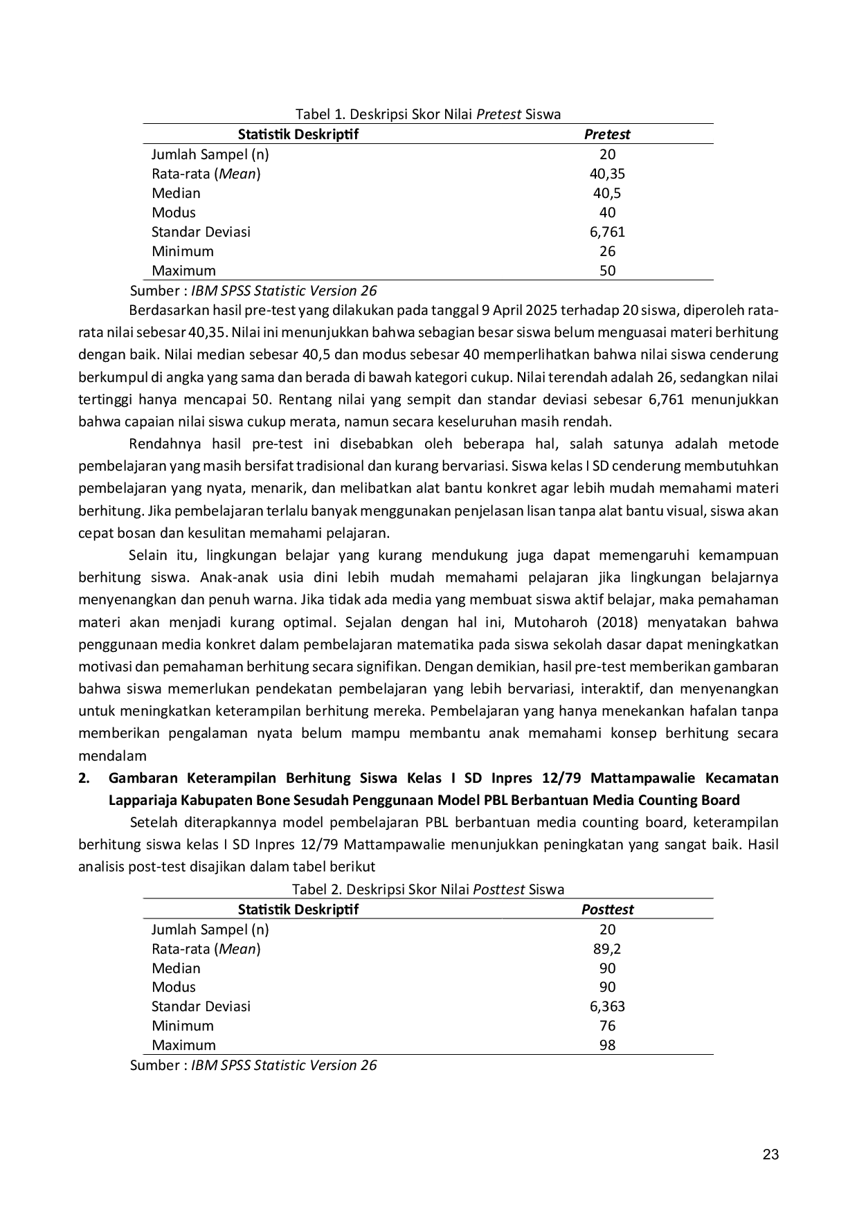 Saqbe: Jurnal Sains dan PembelajarannyaSaqbe: Jurnal Sains dan PembelajarannyaPenelitian ini bertujuan untuk mendeskripsikan keterampilan berhitung siswa kelas I SD Inpres 12/79 Mattampawalie Kecamatan Lappariaja Kabupaten Bone sebelum dan sesudah penerapan model Problem Based Learning (PBL) berbantuan media counting board, serta untuk mengetahui perbedaan keterampilan berhitung siswa sebelum dan sesudah perlakuan. Jenis penelitian ini adalah penelitian pra-eksperimen dengan desain one group pretest-posttest. Subjek dalam penelitian ini adalah 20 siswa kelas I. Teknik pengumpulan data dilakukan melalui tes keterampilan berhitung yang diberikan sebelum dan sesudah penerapan model PBL berbantuan media counting board. Hasil penelitian menunjukkan bahwa sebelum penerapan model PBL, rata-rata nilai keterampilan berhitung siswa adalah 40,35 yang tergolong rendah. Setelah penerapan, rata-rata meningkat menjadi 89,2 yang termasuk dalam kategori sangat baik. Hasil uji hipotesis dengan menggunakan uji Paired Sample t-Test menunjukkan nilai signifikansi sebesar 0,000 < 0,05 dan nilai thitung (26,165) > ttabel (2,09302), yang berarti terdapat perbedaan signifikan antara nilai pretest dan posttest. Dengan demikian, dapat disimpulkan bahwa model pembelajaran PBL berbantuan media counting board berpengaruh secara signifikan terhadap peningkatan keterampilan berhitung siswa. Model PBL mampu meningkatkan interkasi dan keaktifan dalam pembelajaran.
