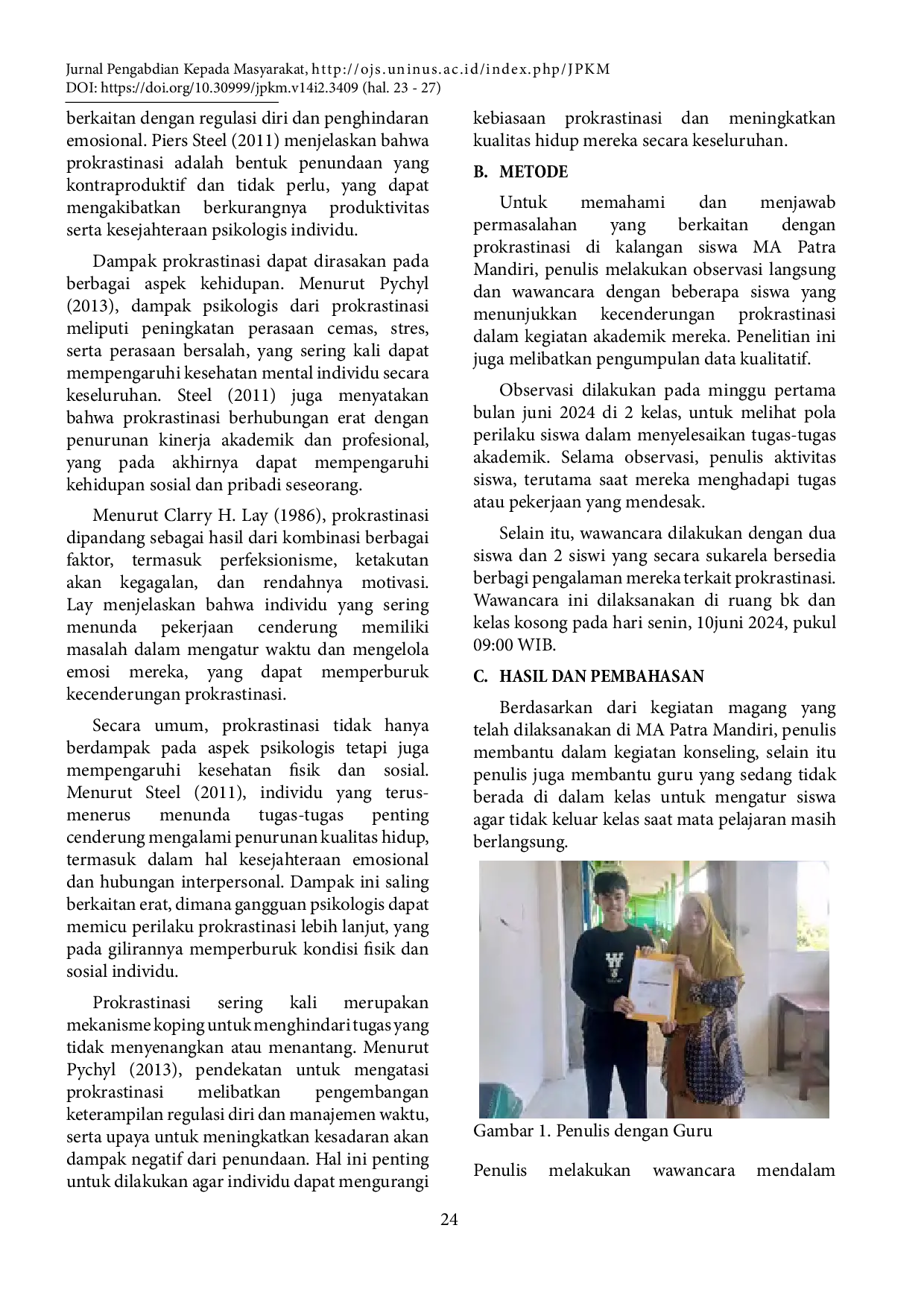 JURNAL PENGABDIAN KEPADA MASYARAKATJURNAL PENGABDIAN KEPADA MASYARAKATProkrastinasi tidak hanya menjadi tembok yang menghalangi antara siswa dan siswi untuk mencapai prestasi akademis, tetapi juga merugikan kesejahteraan psikologis dan perkembangan pribadi siswa dan siswi. Beberapa faktor yang memperhatikan sikap masing-masing siswa dan siswi dapat menyebabkan stres, ketidakpedulian belajar, dan kekurangan kemampuan untuk mencapai target pendidikan. Oleh karenaitu, tujuan dari proyek riset adalah untuk mengetahui faktor prokrastinasi yang mempengaruhi siswa dan siswi. Dalam riset ini, metode kualitatif terpilih, dan data diperoleh melalui wawancara dan observasi. Akhirnya, kami tiba pada kesimpulan bahwa tekanan akademis dan tekanan sosial, masalah waktu dan manajemen motivasi adalah faktor prokrastinasi yang mempengaruhi siswa dan siswi MA Patra Mandiri.