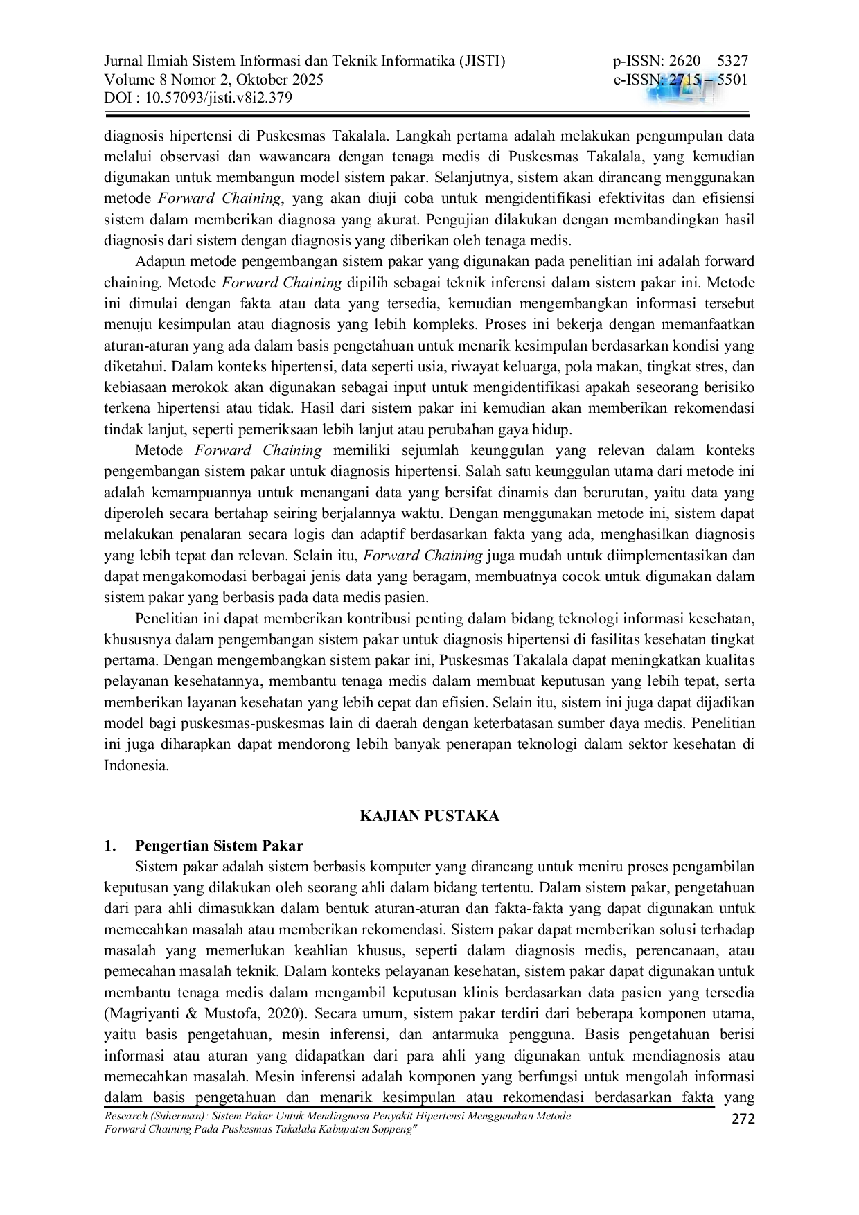 Sistem pakar ini dirancang untuk mengidentifikasi hubungan antara gejala-gejala hipertensi dengan kondisi kesehatan pasien menggunakan basis pengetahuan yang ada di Puskesmas Takalala.Hasil implementasi menunjukkan bahwa sistem berhasil memberikan diagnosis yang akurat berdasarkan input gejala pasien setelah diintegrasikan dengan metode Forward Chaining.Sistem ini terbukti efektif dan efisien dalam membantu tenaga medis dalam mendiagnosis hipertensi, baik dari segi akurasi maupun pengurangan waktu diagnosis dibanding metode konvensional.