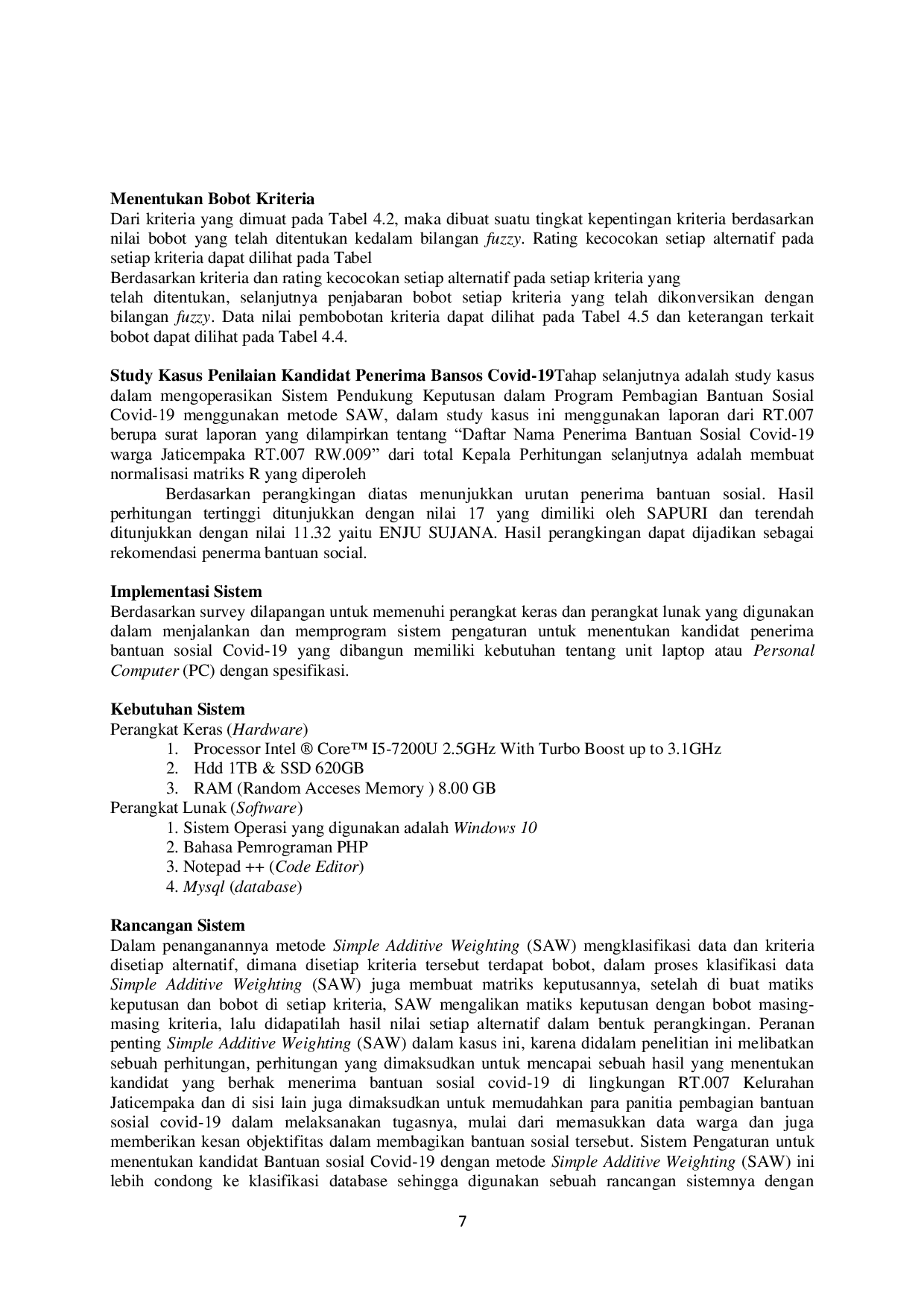 Berdasarkan permasalahan dan arah tujuan penelitian ini, dapat disimpulkan bahwa pengaturan dalam penentuan kandidat penerima bantuan sosial Covid-19 di lingkungan Kelurahan Jaticempaka, Kecamatan Pondokgede masih menerapkan sistem konvensional dalam penentuan kandidat penerima hanya berdasarkan musyawarah bersama, tanpa mengumpulkan kriteria dan alternatif yang ada.Hal ini dapat menimbulkan masalah sosial di wilayah tersebut.Untuk menanggulangi masalah ini, diperlukan sebuah sistem yang dapat digunakan untuk penentuan kandidat penerima bantuan sosial Covid-19 dengan mempertimbangkan segala aspek kriteria.Sistem pengaturan dalam penentuan kandidat penerima bantuan sosial Covid-19 ini dapat membantu panitia dalam pembagian bantuan sosial, apakah sesuai dengan aturan dan kriteria yang berlaku, sehingga dapat mensukseskan pelayanan masyarakat di lingkungan Kelurahan Jaticempaka, Kecamatan Pondokgede, Kota Bekasi.Metode Simple Additive Weighting (SAW) digunakan dalam memproses data warga yang akan menerima bantuan sosial Covid-19.