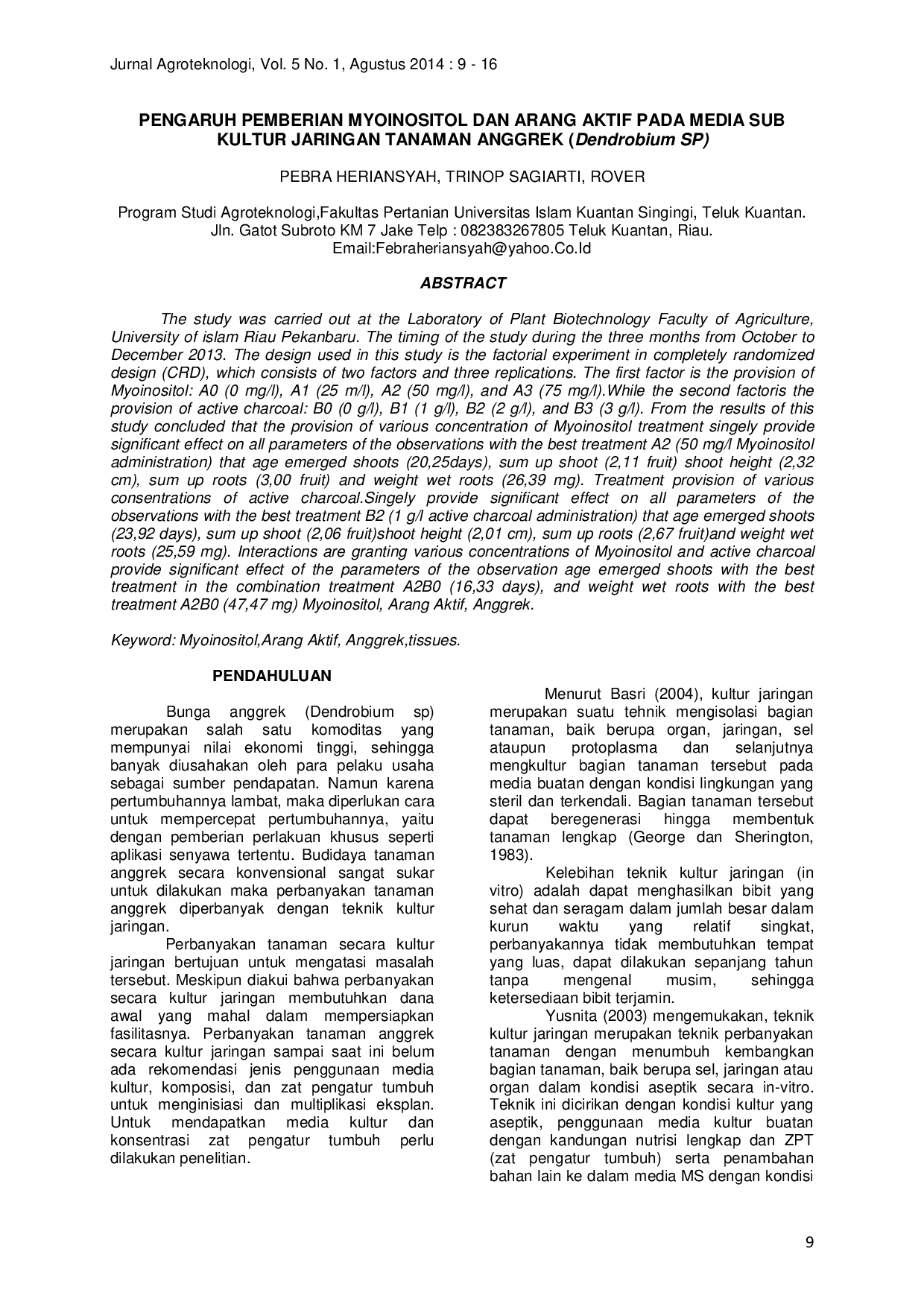 Jurnal AgroteknologiJurnal AgroteknologiPenelitian ini dilaksanakan di Laboratorium Bioteknologi Tanaman Fakultas Pertanian Universitas Islam Riau Pekanbaru selama tiga bulan dari Oktober hingga Desember 2013. Rancangan yang digunakan adalah percobaan faktorial dalam rancangan acak lengkap (RAL) yang terdiri dari dua faktor dan tiga ulangan. Faktor pertama adalah pemberian Myoinositol: A0 (0 mg/l), A1 (25 mg/l), A2 (50 mg/l), dan A3 (75 mg/l). Faktor kedua adalah pemberian arang aktif: B0 (0 g/l), B1 (1 g/l), B2 (2 g/l), dan B3 (3 g/l). Hasil penelitian menunjukkan bahwa pemberian myoinositol secara tunggal memberikan pengaruh nyata terhadap semua parameter pengamatan dengan perlakuan terbaik A2 (pemberian myoinositol 50 mg/l) yang menghasilkan umur muncul tunas (20,25 hari), jumlah tunas (2,11 buah), tinggi tunas (2,32 cm), jumlah akar (3,00 buah), dan berat basah akar (26,39 mg). Pemberian arang aktif secara tunggal memberikan pengaruh nyata terhadap semua parameter pengamatan dengan perlakuan terbaik B0 (tanpa pemberian arang aktif) yang menghasilkan umur muncul tunas (23,92 hari), jumlah tunas (2,06 buah), tinggi tunas (2,01 cm), jumlah akar (2,67 buah), dan berat basah akar (25,59 mg). Interaksi pemberian myoinositol dan arang aktif memberikan pengaruh nyata terhadap parameter umur muncul tunas dengan perlakuan terbaik pada kombinasi A2B0 (16,33 hari), dan berat basah akar dengan perlakuan terbaik A2B0 (47,47 mg).