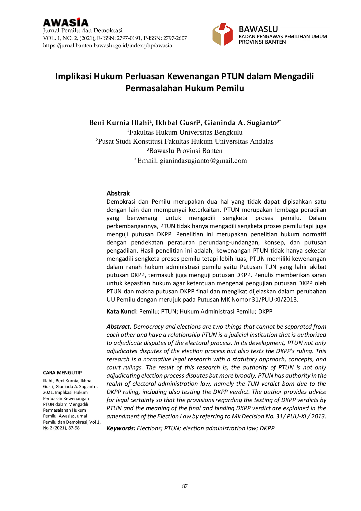Awasia: Jurnal Pemilu dan DemokrasiAwasia: Jurnal Pemilu dan DemokrasiDemokrasi dan Pemilu merupakan dua hal yang tidak dapat dipisahkan satu dengan lain dan mempunyai keterkaitan. PTUN merupakan lembaga peradilan yang berwenang untuk mengadili sengketa proses pemilu. Dalam perkembangannya, PTUN tidak hanya mengadili sengketa proses pemilu tapi juga menguji putusan DKPP. Penelitian ini merupakan penelitian hukum normatif dengan pendekatan peraturan perundang-undangan, konsep, dan putusan pengadilan. Hasil penelitian ini adalah, kewenangan PTUN tidak hanya sekedar mengadili sengketa proses pemilu tetapi lebih luas, PTUN memiliki kewenangan dalam ranah hukum administrasi pemilu yaitu Putusan TUN yang lahir akibat putusan DKPP, termasuk juga menguji putusan DKPP. Penulis memberikan saran untuk kepastian hukum agar ketentuan mengenai pengujian putusan DKPP oleh PTUN dan makna putusan DKPP final dan mengikat dijelaskan dalam perubahan UU Pemilu dengan merujuk pada Putusan MK Nomor 31/PUU-XI/2013.