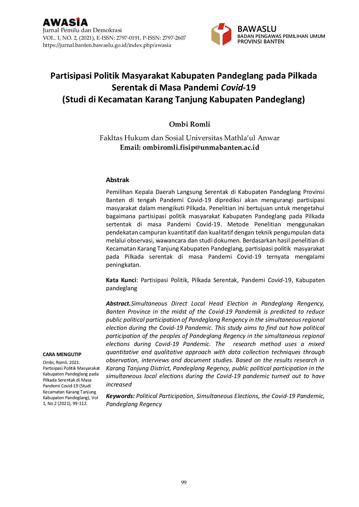 Awasia: Jurnal Pemilu dan DemokrasiAwasia: Jurnal Pemilu dan DemokrasiPemilihan Kepala Daerah Langsung Serentak di Kabupaten Pandeglang Provinsi Banten di tengah Pandemi Covid-19 diprediksi akan mengurangi partisipasi masyarakat dalam mengikuti Pilkada. Penelitian ini bertujuan untuk mengetahui bagaimana partisipasi politik masyarakat Kabupaten Pandeglang pada Pilkada serentak di masa Pandemi Covid-19. Metode Penelitian menggunakan pendekatan campuran kuantitatif dan kualitatif dengan teknik pengumpulan data melalui observasi, wawancara dan studi dokumen. Berdasarkan hasil penelitian di Kecamatan Karang Tanjung Kabupaten Pandeglang, partisipasi politik masyarakat pada Pilkada serentak di masa Pandemi Covid-19 ternyata mengalami peningkatan.
