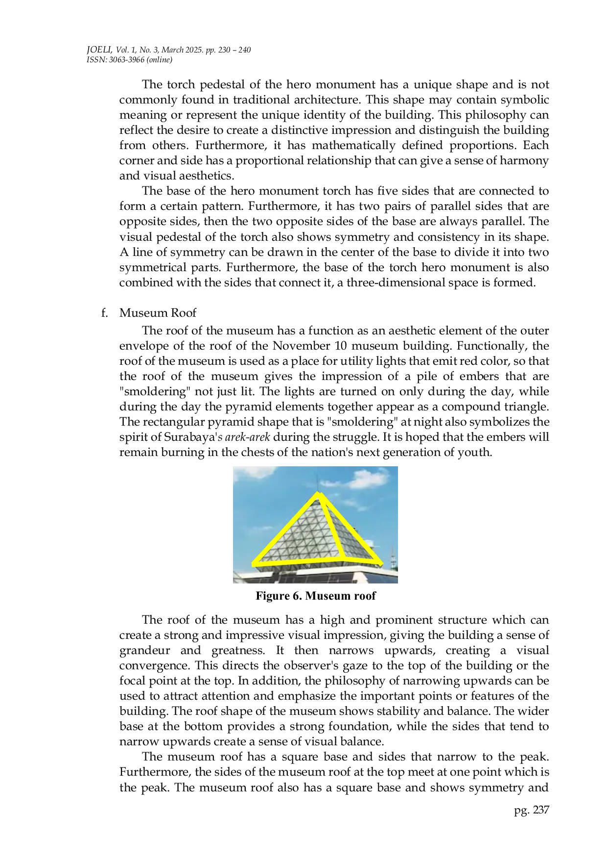 JOELI: Journal of Educational and Learning InnovationJOELI: Journal of Educational and Learning InnovationMatematika adalah konsep abstrak yang dianggap sulit dan membosankan untuk dipelajari oleh siswa. Salah satu studi yang menghubungkan matematika dan budaya disebut etnomatematika. Pembelajaran dengan pendekatan etnomatematika dapat mengeksplorasi lebih dalam antara budaya dan matematika. Penelitian ini bertujuan untuk mengeksplorasi etnomatematika yang terkandung dalam monumen pahlawan Kota Surabaya dan menghasilkan buku sebagai sumber belajar terkait etnomatematika di monumen pahlawan. Jenis penelitian ini adalah deskriptif kualitatif dengan sumber data diperoleh dari observasi, wawancara, literatur dan dokumentasi terkait monumen pahlawan Kota Surabaya. Hasil penelitian menunjukkan bahwa konsep matematika yang terkandung dalam monumen pahlawan Kota Surabaya meliputi kegiatan desain dan geometri tingkat sekolah menengah pertama. Kegiatan desain meliputi mengidentifikasi model bangunan yang memiliki estetika matematika dan geometri tingkat sekolah menengah pertama di area monumen pahlawan meliputi segitiga sama kaki, persegi, trapesium, dan lingkaran. Selain itu, ruang bangunan meliputi prisma pentagonal, piramida persegi panjang, kerucut dan tabung.