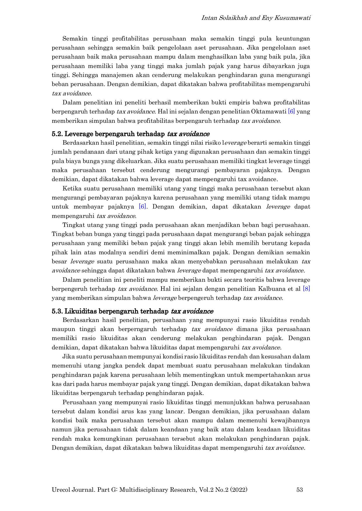 The study concludes that profitability, leverage, liquidity, and the audit committee influence tax avoidance, while company size does not.This suggests that companies with higher profitability, leverage, and liquidity are more likely to engage in tax avoidance strategies.The presence of an audit committee also appears to be associated with tax avoidance.However, the size of the company does not seem to play a significant role in its tax avoidance practices.