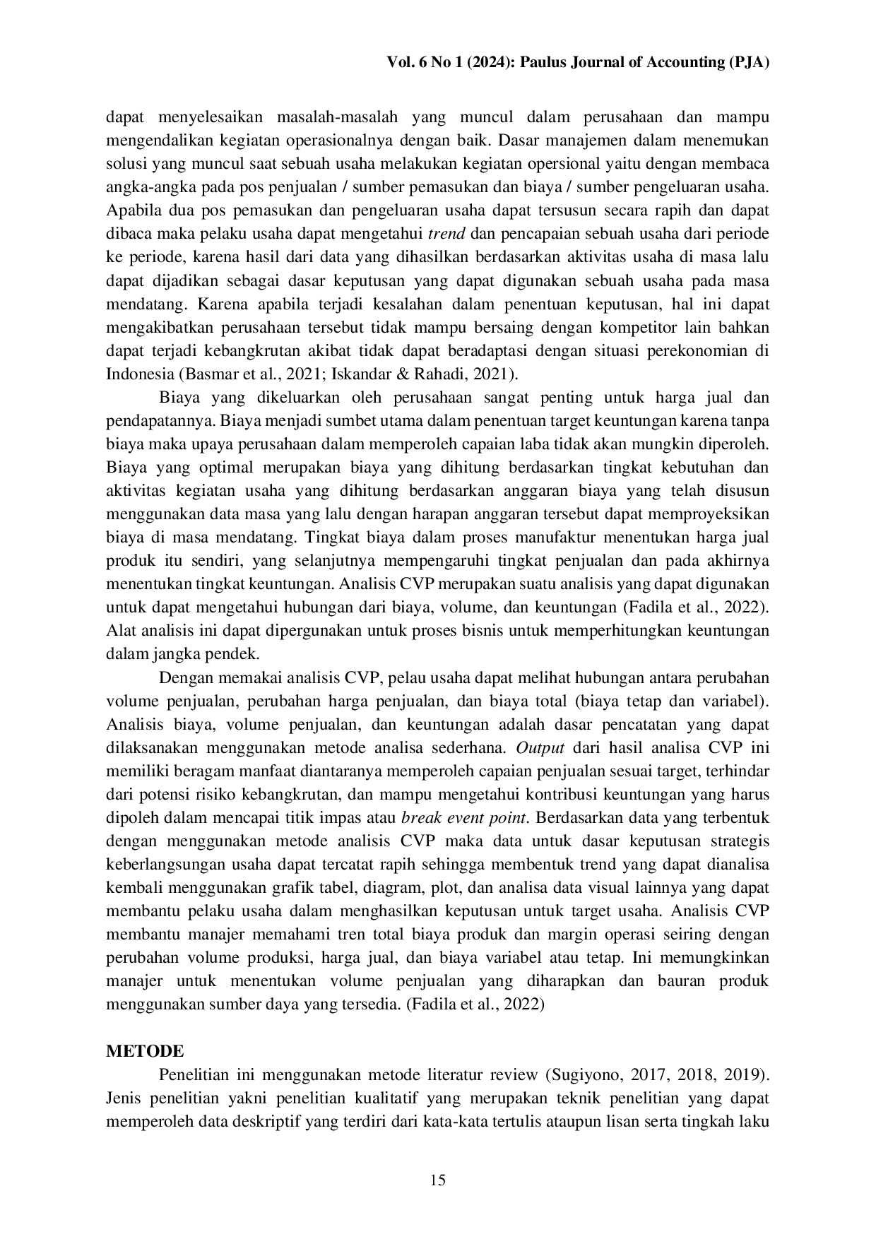 Paulus Journal of Accounting (PJA)Paulus Journal of Accounting (PJA)Tujuan dari penelitian ini yakni untuk mengetahui penerapan analisis CVP pada UMKM. Metode penelitian yang digunakan yakni review literatur yang merupakan suatu metode secara eksplisit, sistematis dan reprodusibel untuk mengidentifikasi, mengevaluasi dan mengsintesis temuan dan ide penelitian yang dihasilkan oleh peneliti di jurnal yang ada. Jenis penelitian yaitu penelitian kualitatif dengan objek penelitian pada UMKM. Artikel yang dipakai pada penelitian ini berjumlah 7 artikel jurnal publikasi yang diperoleh dari google scholar. Adapun rujukan dari riset ini diperoleh berdasarkan rujukan jurnal maupun artikel yang diterbitkan melalui jurnal online dengan kata kunci “perencanaan laba umkm. Hasil penelitian ini ditemukan bahwa penerapan analisis CVP sebagai alat perencanaan laba belum banyak diterapkan di semua UMKM, sehingga banyak yang tidak mengetahui peluang potensial dan perkiraan laba/rugi operasi untuk periode mendatang. Perencanaan laba dengan analisis CVP, dapat membantu manajer untuk mencapai tujuan sesuai rencana, sehingga terhindar dari kerugian dan dapat memperoleh keuntungan yang bisa dilihat dari perhitungan BEP, perhitungan titik aman penjualan atau Margin Of Safety dan Contribusi Margin.