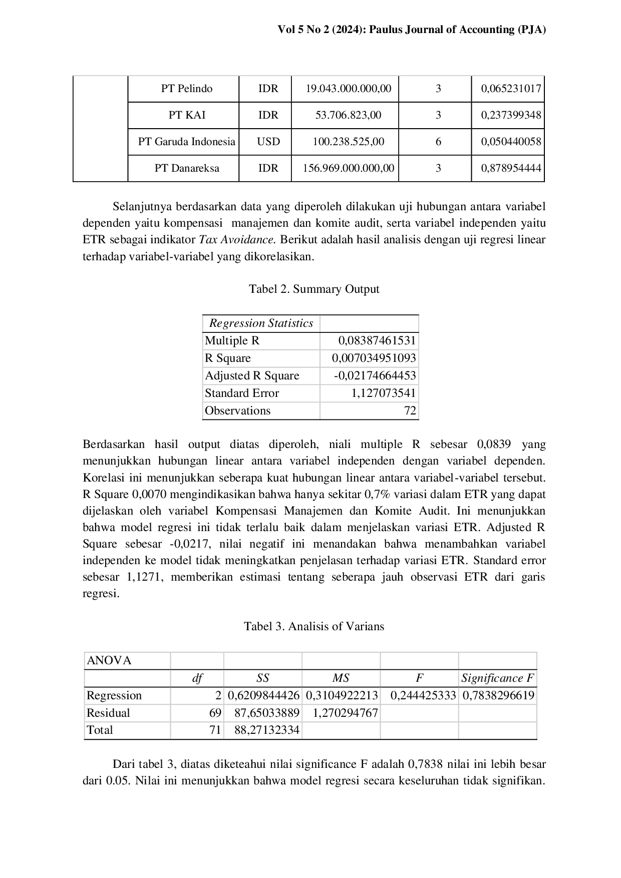 Penggunaan ETR sebagai indikator penghindaran pajak mengungkapkan bahwa model regresi yang digunakan dalam analisis ini tidak cukup kuat untuk menjelaskan variasi dalam ETR berdasarkan kompensasi manajemen dan komite audit.Hal ini ditunjukkan oleh rendahnya nilai R Square dan tingginya P-value pada kedua variabel independen.Oleh karena itu, meskipun ETR adalah alat yang berguna untuk mengukur penghindaran pajak, analisis ini menunjukkan bahwa faktor-faktor lain mungkin lebih relevan dan perlu dipertimbangkan untuk memberikan gambaran yang lebih akurat tentang bagaimana perusahaan menghindari pajak.Penelitian lebih lanjut yang melibatkan variabel tambahan atau pendekatan metodologis yang berbeda diperlukan untuk memahami dinamika penghindaran pajak secara lebih komprehensif.