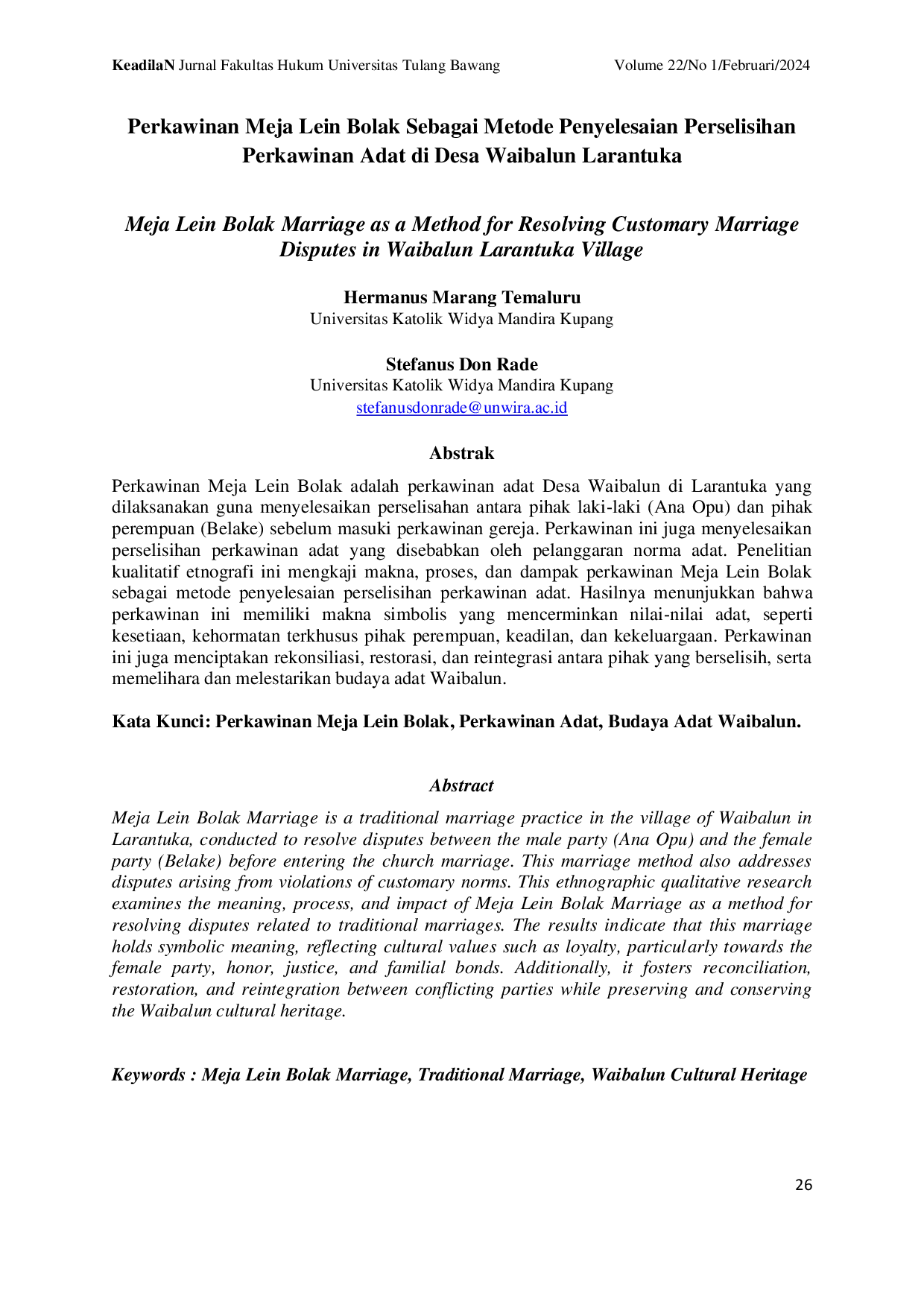 KeadilanKeadilanPerkawinan Meja Lein Bolak adalah perkawinan adat Desa Waibalun di Larantuka yang dilaksanakan guna menyelesaikan perselisahan antara pihak laki-laki (Ana Opu) dan pihak perempuan (Belake) sebelum masuki perkawinan gereja. Perkawinan ini juga menyelesaikan perselisihan perkawinan adat yang disebabkan oleh pelanggaran norma adat. Penelitian kualitatif etnografi ini mengkaji makna, proses, dan dampak perkawinan Meja Lein Bolak sebagai metode penyelesaian perselisihan perkawinan adat. Hasilnya menunjukkan bahwa perkawinan ini memiliki makna simbolis yang mencerminkan nilai-nilai adat, seperti kesetiaan, kehormatan terkhusus pihak perempuan, keadilan, dan kekeluargaan. Perkawinan ini juga menciptakan rekonsiliasi, restorasi, dan reintegrasi antara pihak yang berselisih, serta memelihara dan melestarikan budaya adat Waibalun.