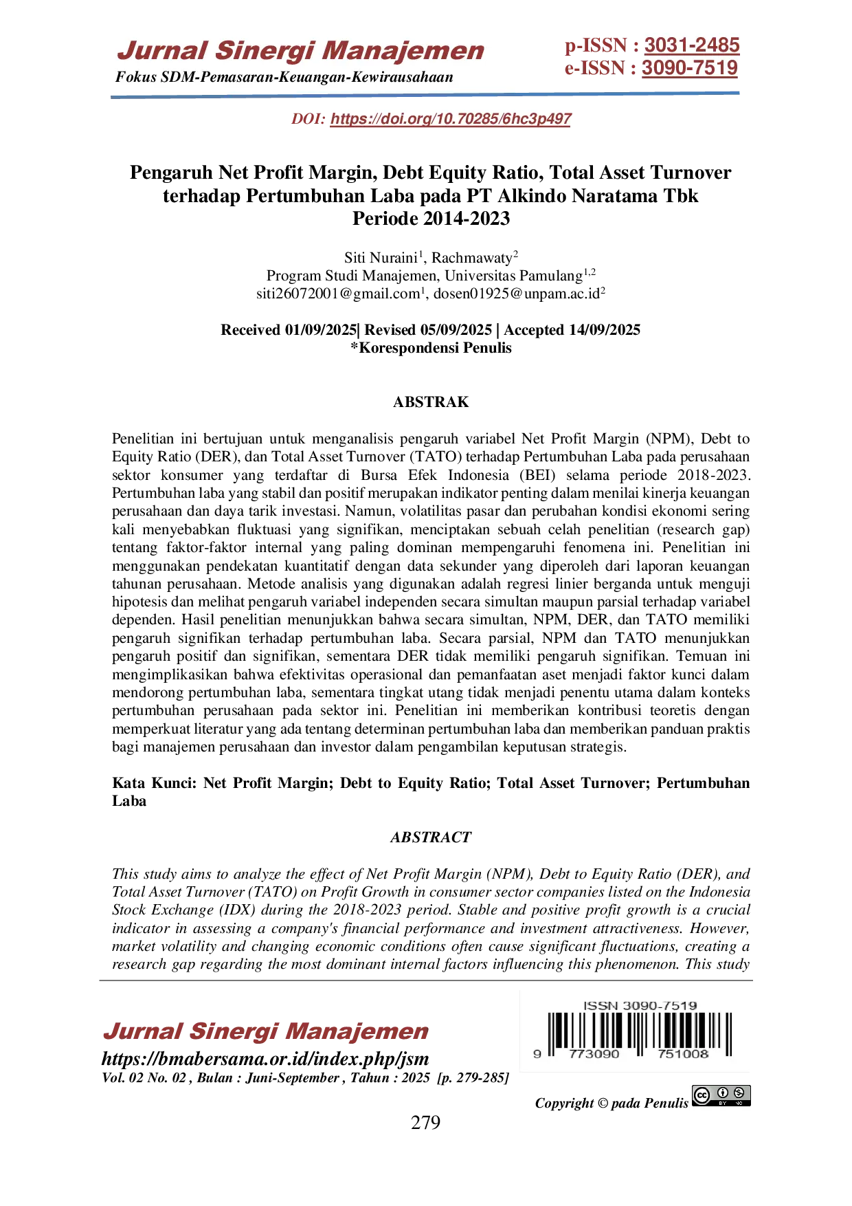 Jurnal Sinergi ManajemenJurnal Sinergi ManajemenPenelitian ini bertujuan untuk menganalisis pengaruh variabel Net Profit Margin (NPM), Debt to Equity Ratio (DER), dan Total Asset Turnover (TATO) terhadap Pertumbuhan Laba pada perusahaan sektor konsumer yang terdaftar di Bursa Efek Indonesia (BEI) selama periode 2018-2023. Pertumbuhan laba yang stabil dan positif merupakan indikator penting dalam menilai kinerja keuangan perusahaan dan daya tarik investasi. Namun, volatilitas pasar dan perubahan kondisi ekonomi sering kali menyebabkan fluktuasi yang signifikan, menciptakan sebuah celah penelitian (research gap) tentang faktor-faktor internal yang paling dominan mempengaruhi fenomena ini. Penelitian ini menggunakan pendekatan kuantitatif dengan data sekunder yang diperoleh dari laporan keuangan tahunan perusahaan. Metode analisis yang digunakan adalah regresi linier berganda untuk menguji hipotesis dan melihat pengaruh variabel independen secara simultan maupun parsial terhadap variabel dependen. Hasil penelitian menunjukkan bahwa secara simultan, NPM, DER, dan TATO memiliki pengaruh signifikan terhadap pertumbuhan laba. Secara parsial, NPM dan TATO menunjukkan pengaruh positif dan signifikan, sementara DER tidak memiliki pengaruh signifikan. Temuan ini mengimplikasikan bahwa efektivitas operasional dan pemanfaatan aset menjadi faktor kunci dalam mendorong pertumbuhan laba, sementara tingkat utang tidak menjadi penentu utama dalam konteks pertumbuhan perusahaan pada sektor ini. Penelitian ini memberikan kontribusi teoretis dengan memperkuat literatur yang ada tentang determinan pertumbuhan laba dan memberikan panduan praktis bagi manajemen perusahaan dan investor dalam pengambilan keputusan strategis.
