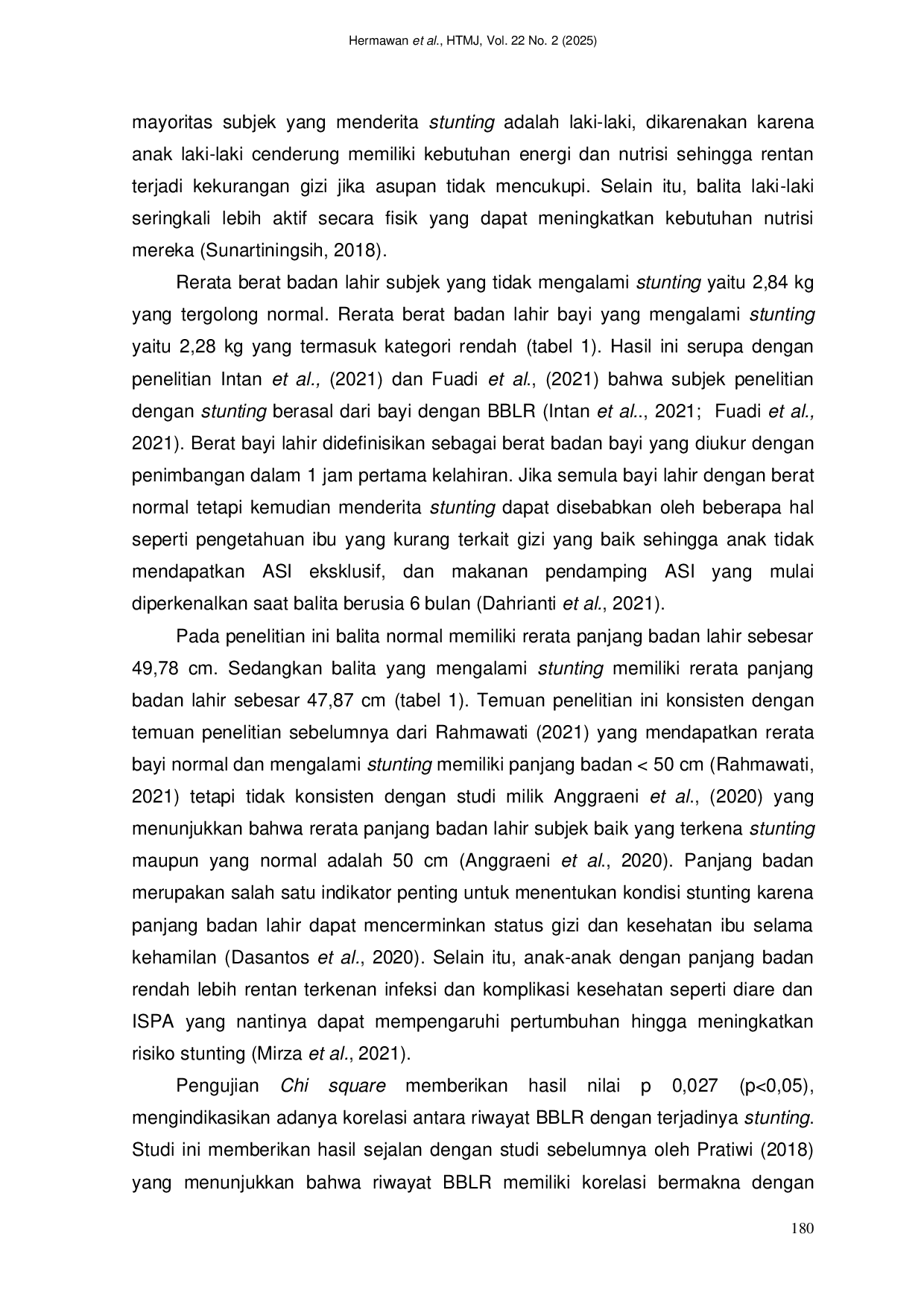 Hang Tuah Medical JournalHang Tuah Medical JournalStunting masih menjadi permasalahan gizi kronis yang sering dihadapi oleh balita pada masa sekarang. Kondisi stunting dapat mengganggu perkembangan fisik dan fungsi kognitif hingga meningkatkan risiko kematian. Riwayat berat badan lahir rendah (BBLR) menjadi salah satu faktor risiko stunting. Penelitian ini bertujuan untuk mengidentifikasi keterkaitan antara BBLR dengan terjadinya stunting pada balita berusia 24 sampai 60 bulan di Puskesmas Tabanan I tahun 2018-2019. Metode penelitian yang diterapkan adalah analitik dengan format studi kasus kontrol, dengan data sekunder yang berasal dari bagian gizi dan kesehatan ibu anak di Puskesmas Tabanan I. Subjek penelitian dipilih dengan teknik consecutive sampling yaitu sejumlah 190 balita yang tercatat dalam laporan stunting dan BBLR sesuai kriteria eksklusi dan inklusi. Data dianalisis secara univariat dan bivariat dengan aplikasi SPSS versi 25.0 menggunakan uji korelasi Spearman. Berdasarkan hasil uji Chi square, ditemukan nilai p sebesar 0,027 (p<0,05), menunjukkan adanya hubungan antara BBLR dengan terjadinya stunting pada anak berusia 24-60 bulan. Selain itu, nilai OR sebesar 2,17 mengindikasikan bahwa balita dengan riwayat BBLR memiliki risiko 2,17 kali lipat lebih tinggi untuk menderita stunting.