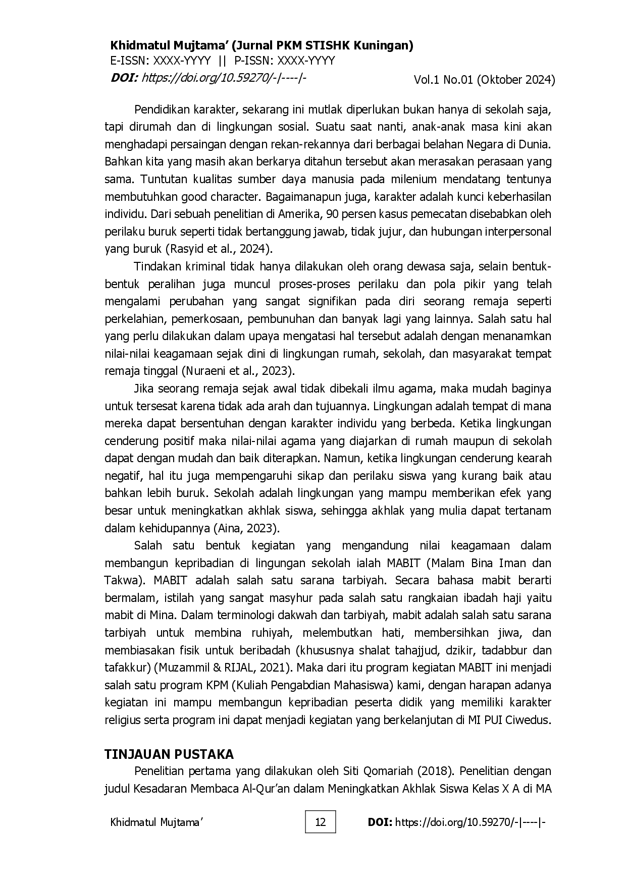 Khidmatul Mujtama': Jurnal Pengabdian kepada MasyarakatKhidmatul Mujtama': Jurnal Pengabdian kepada MasyarakatMABIT adalah salah satu sarana tarbiyah untuk membina ruhiyah, melembutkan hati, membersihkan jiwa, dan membiasakan fisik untuk beribadah (khususnya shalat tahajjud, dzikir, tadabbur dan tafakkur). Pelaksanaan kegiatan MABIT ini ditujukan untuk murid kelas 5 & 6 MI PUI Ciwedus 1 desa Timbang Kecamatan Cigandamekar Kabupaten Kuningan. Tujuan dari MABIT ini diantaranya dapat meningkatkan iman dan takwa para peserta didik, lebih mendekatkan diri mereka kepada Allah Swt., menjadi terbiasakan menjalankan shalat-shalat sunah yang biasa dilakukan Rasulullah Saw., dan agar lebih bisa menghargai waktu. Metodologi yang digunakan dalam penelitian ini adalah ABCD (Asset Bassed Community Development). Adapun hasil dari kegiatan ini dapat membantu membentuk kepribadian muslim khususnya pada diri peserta didik MI PUI Ciwedus 1.