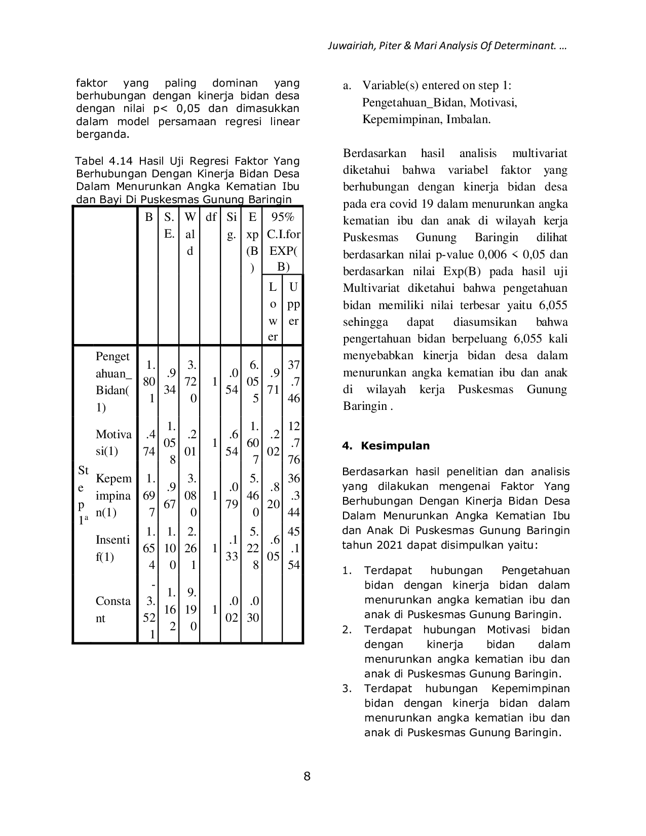 Based on the results of the research and analysis conducted regarding the Factors Related to the Performance of Village Midwives in Reducing Maternal and Child Mortality at the Gunung Baringin Health Center in 2021, it can be concluded that there is a relationship between midwives knowledge and the performance of midwives in reducing maternal and child mortality at the Gunung Baringin Health Center.Furthermore, there is a relationship between midwives motivation and the performance of midwives in reducing maternal and child mortality at the Gunung Baringin Health Center.Finally, there is a relationship between midwife leadership and the performance of midwives in reducing maternal and child mortality at the Gunung Baringin Health Center.
