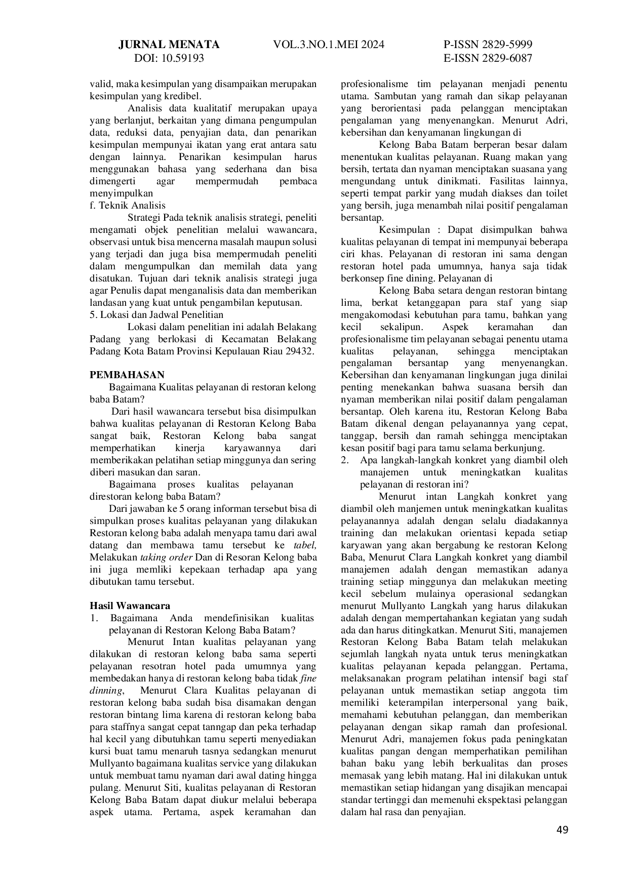 JURNAL MENATAJURNAL MENATARestoran merupakan bagian penting dari industri pariwisata, berperan dalam memenuhi kebutuhan wisatawan atau pelanggan. Kualitas pelayanan yang baik sangat menentukan perkembangan restoran, di luar kualitas makanan dan minuman. Penelitian ini bertujuan untuk menganalisis penerapan kualitas pelayanan dan memberikan perbaikan dalam pengelolaan Restoran Kelong Baba Batam, sehingga kualitas pelayanan restoran dapat ditingkatkan. Penelitian ini menggunakan pendekatan kualitatif deskriptif. Restoran Kelong Baba Batam memiliki konsep modern dengan interior yang menarik, menciptakan kenyamanan bagi pengunjung. Restoran ini juga sangat responsif terhadap kebutuhan pengunjung, sehingga meningkatkan kenyamanan mereka.