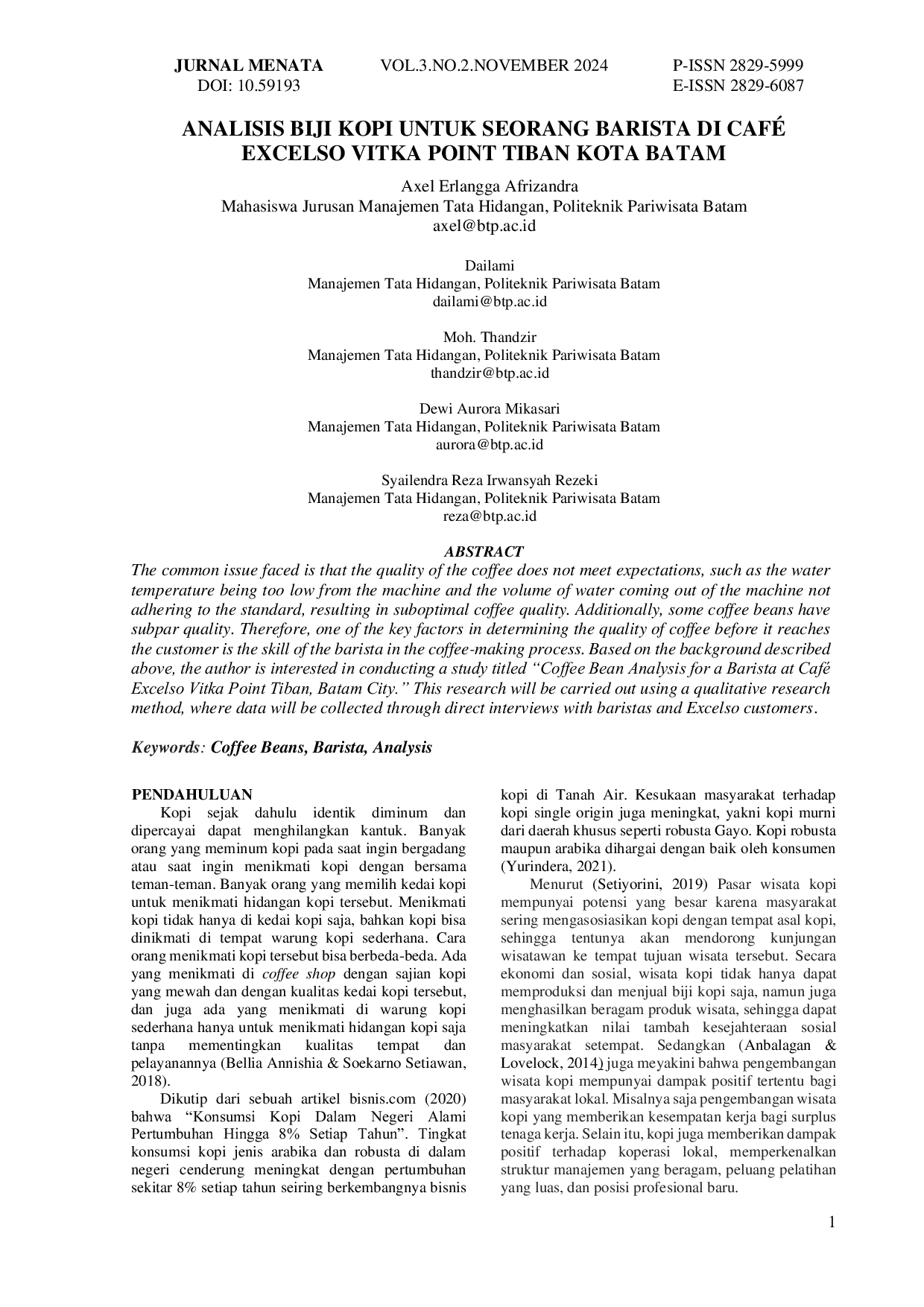 JURNAL MENATAJURNAL MENATAPenelitian ini membahas mengenai kualitas kopi yang tidak memenuhi ekspektasi, seperti suhu air mesin yang kurang optimal dan volume air yang tidak sesuai standar, serta kualitas biji kopi yang kurang maksimal. Oleh karena itu, penelitian ini bertujuan untuk menganalisis biji kopi yang digunakan oleh barista di Café Excelso Vitka Point Tiban, Batam. Penelitian ini menggunakan metode kualitatif dengan pengumpulan data melalui wawancara dengan barista dan pelanggan Café Excelso. Hasil penelitian menunjukkan bahwa Café Excelso menggunakan biji kopi arabika dan robusta, dengan arabika lebih sering digunakan karena kadar kafeinnya yang lebih rendah dan rasa yang khas.