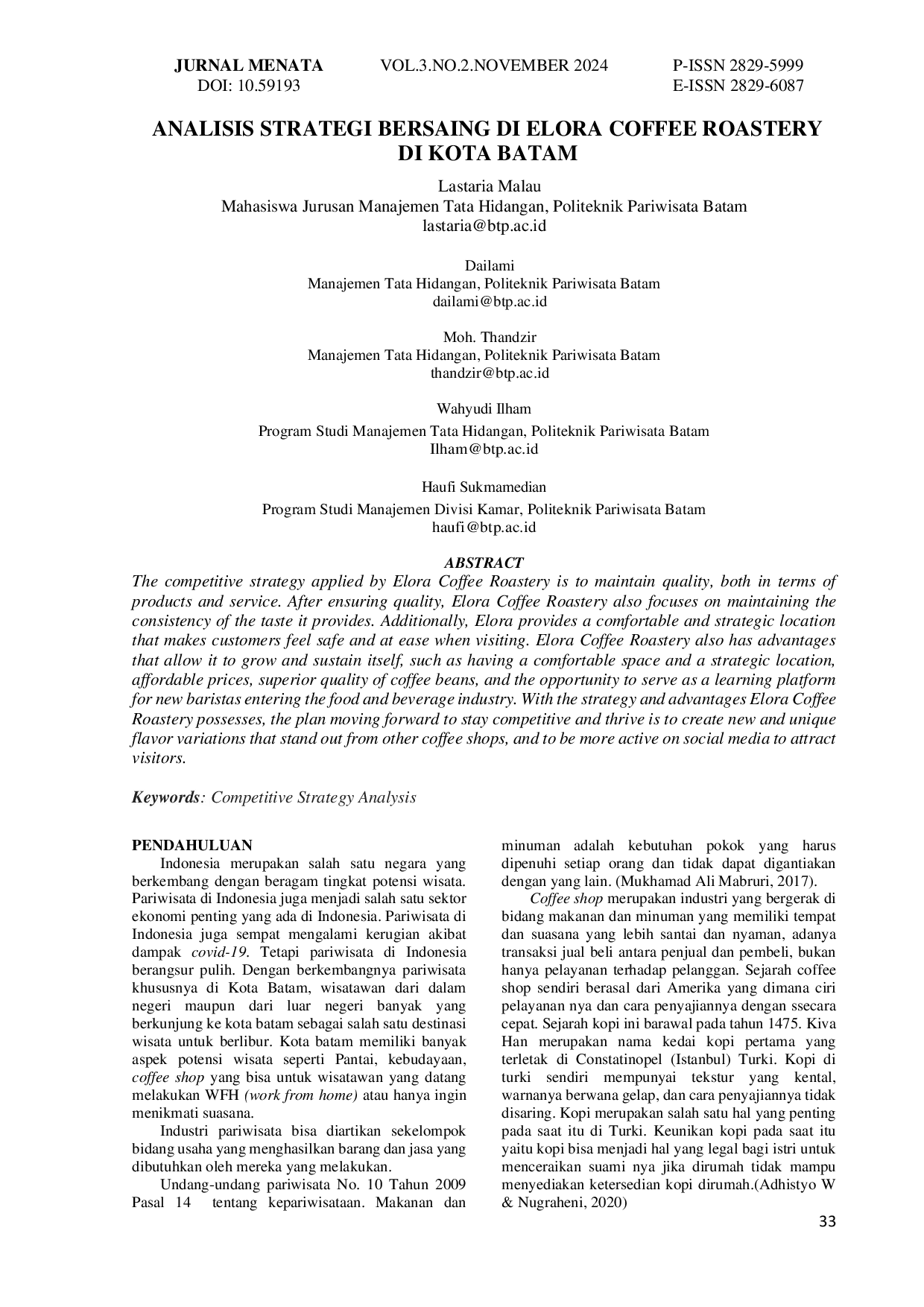 JURNAL MENATAJURNAL MENATAStrategi bersaing yang diterapkan oleh Elora Coffee Roastery adalah menjaga kualitas, baik dari segi produk maupun pelayanan. Setelah memastikan kualitas, Elora Coffee Roastery juga fokus pada menjaga konsistensi rasa yang disajikan. Selain itu, Elora menyediakan lokasi yang nyaman dan strategis yang membuat pelanggan merasa aman dan tenang saat berkunjung. Elora Coffee Roastery juga memiliki keunggulan yang memungkinkan untuk tumbuh dan bertahan, seperti memiliki ruang yang nyaman dan lokasi strategis, harga terjangkau, kualitas biji kopi yang unggul, dan kesempatan untuk menjadi platform pembelajaran bagi barista baru yang memasuki industri makanan dan minuman. Dengan strategi dan keunggulan yang dimiliki Elora Coffee Roastery, rencana ke depan untuk tetap kompetitif dan berkembang adalah menciptakan variasi rasa baru yang unik yang menonjol dari kedai kopi lain, dan menjadi lebih aktif di media sosial untuk menarik pengunjung.